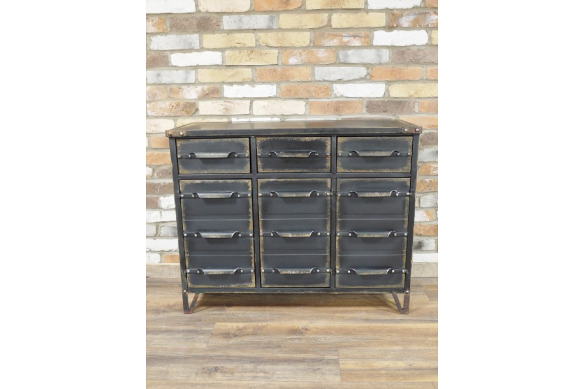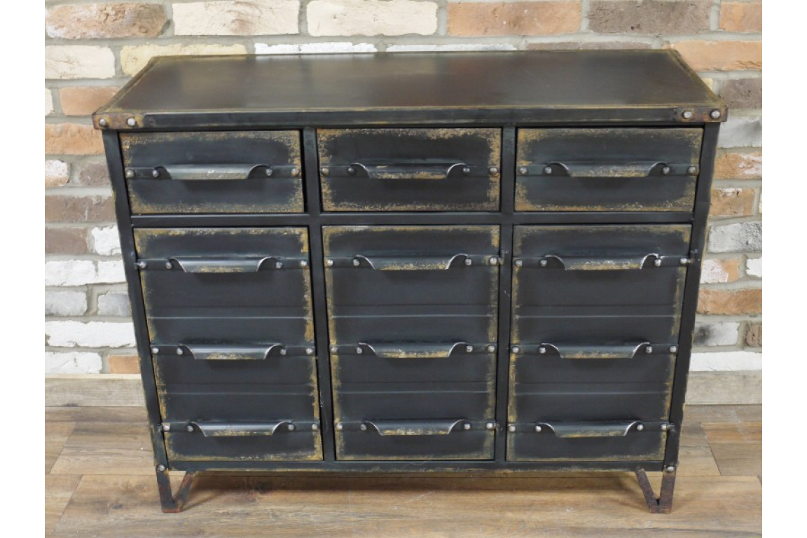 This industrial cabinet combines functionality with a rugged aesthetic, perfect for adding a touch of urban flair to any space. The top row features drawers for storing smaller items, while the bottom section consists of doors that open to reveal spacious shelves. The metal frame and distressed finish give this cabinet a vintage industrial look, making it a versatile piece for both modern and rustic interiors.