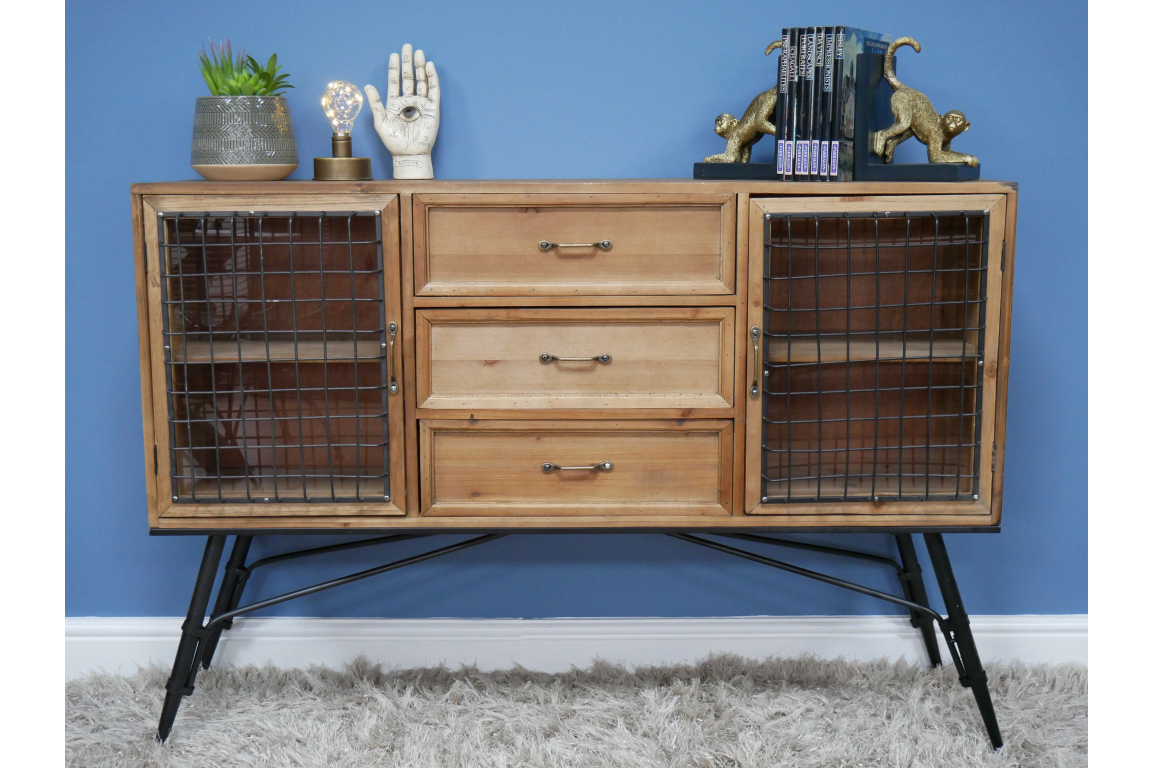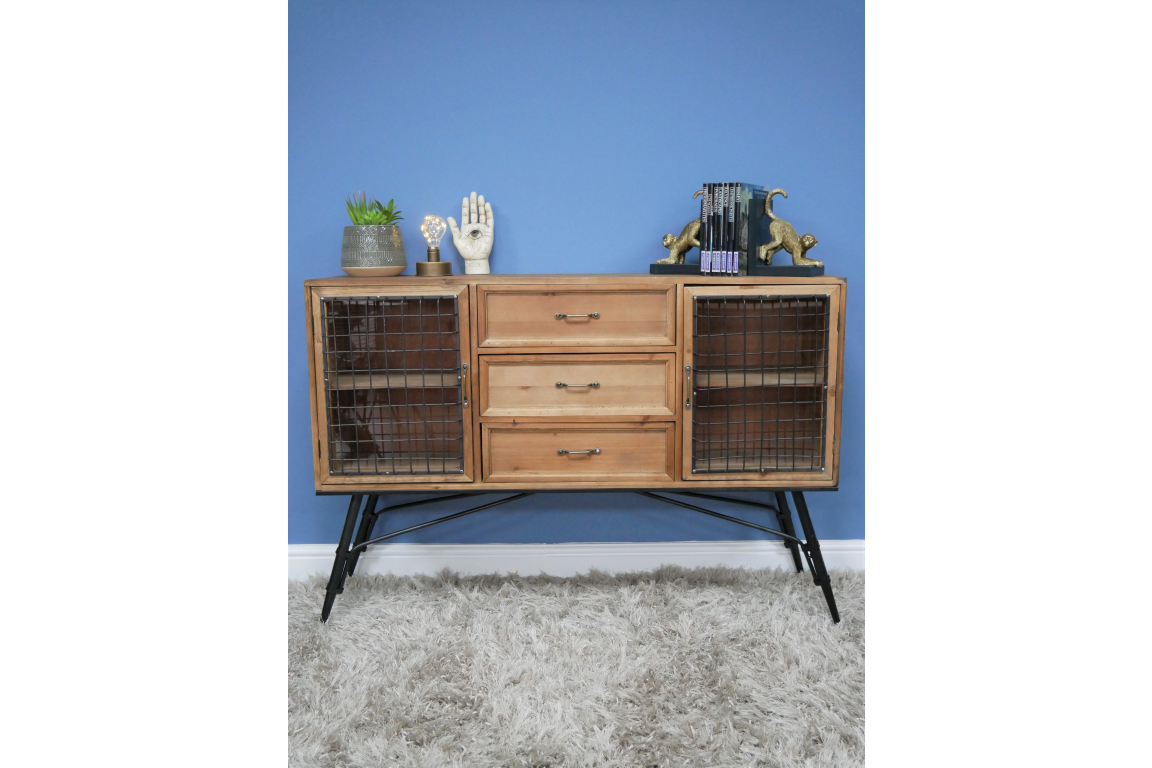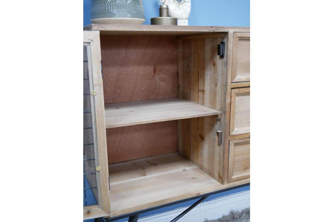 This industrial cabinet combines rustic charm with modern functionality, making it a versatile addition to any home or office space. The fir wood panels exude warmth and character, while the sleek metal frame adds an industrial edge to the overall design.
