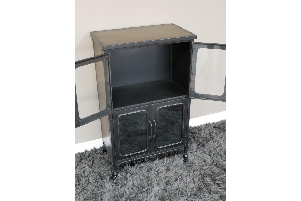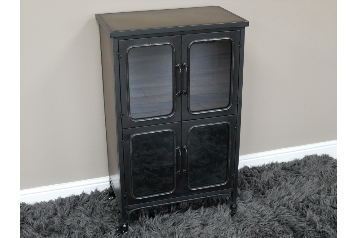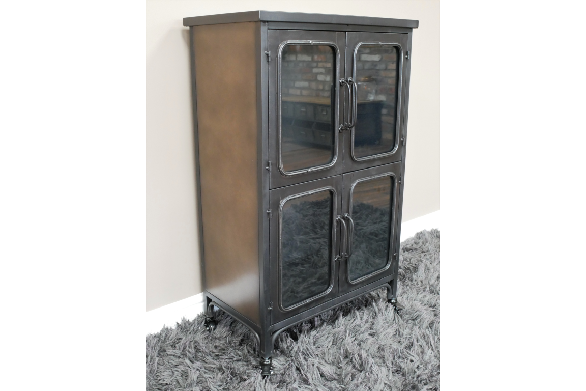 This industrial cabinet combines rugged metal with sleek glass to create a striking storage solution for modern homes. The metal frame features clean lines and a distressed finish, giving it a vintage industrial look that adds character to any room. The glass cabinet doors allow you to showcase your favorite items while keeping them protected from dust and dirt.
