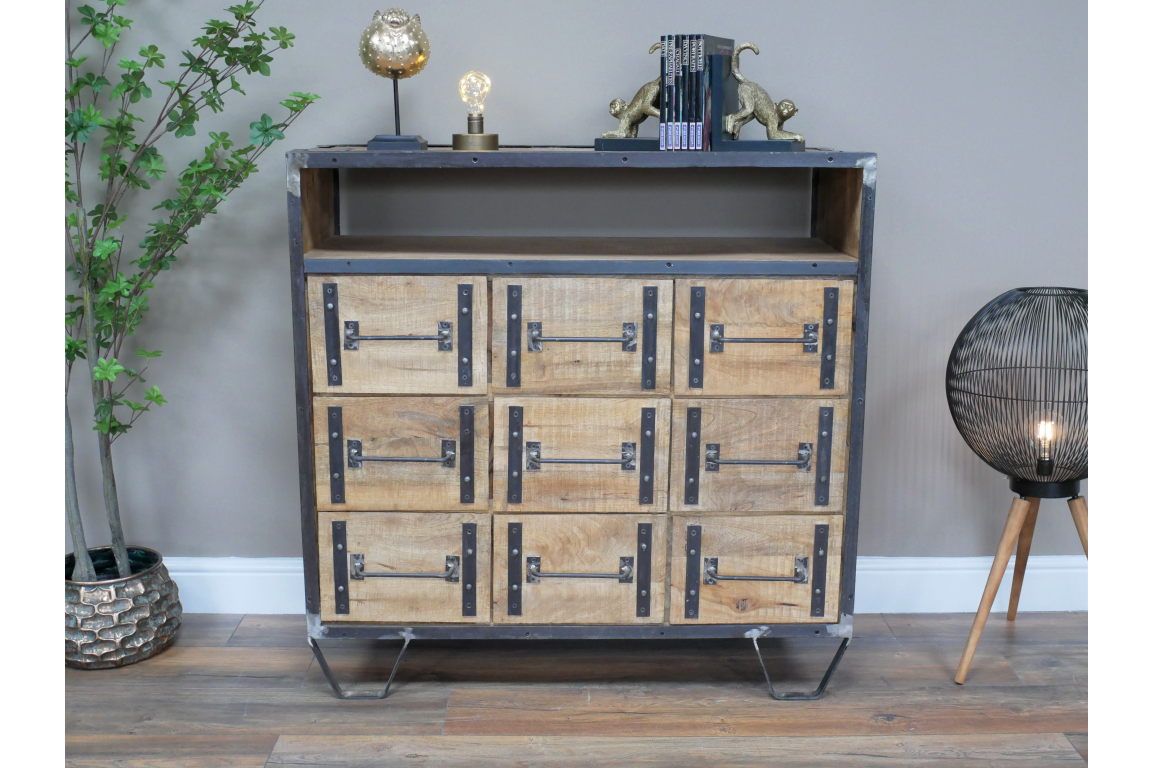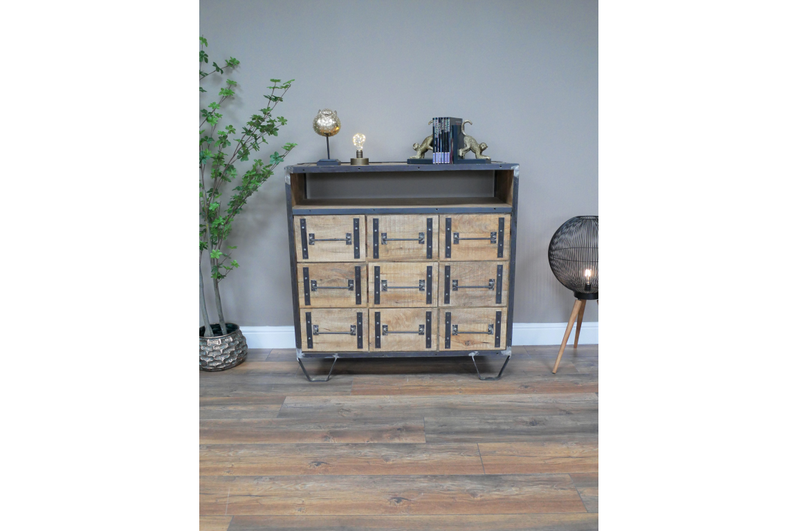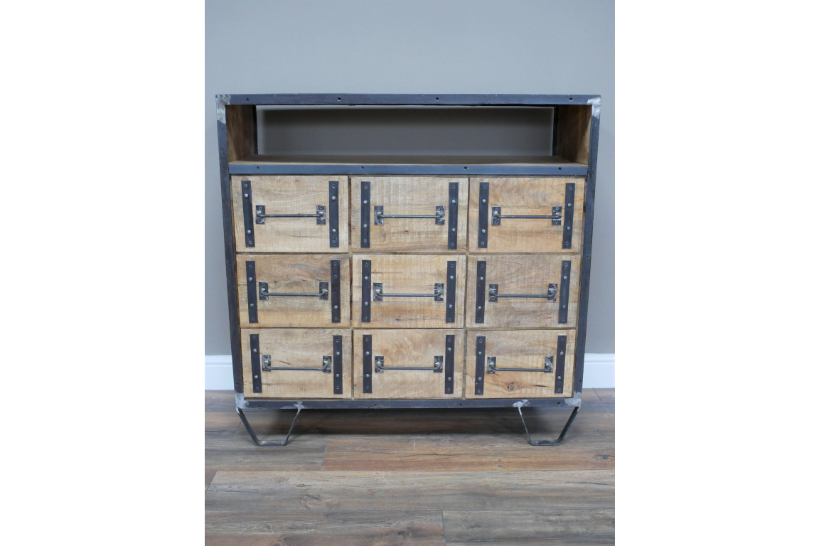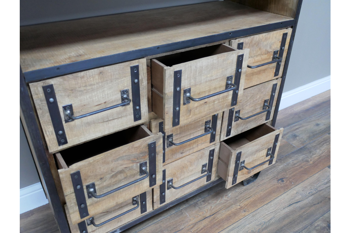 This industrial cabinet is a striking piece of furniture that seamlessly blends rustic charm with modern design. Crafted from mango wood and iron, it features a robust construction that exudes industrial appeal. The natural variations in the wood grain add character and warmth to the overall aesthetic, making it a versatile addition to any room.