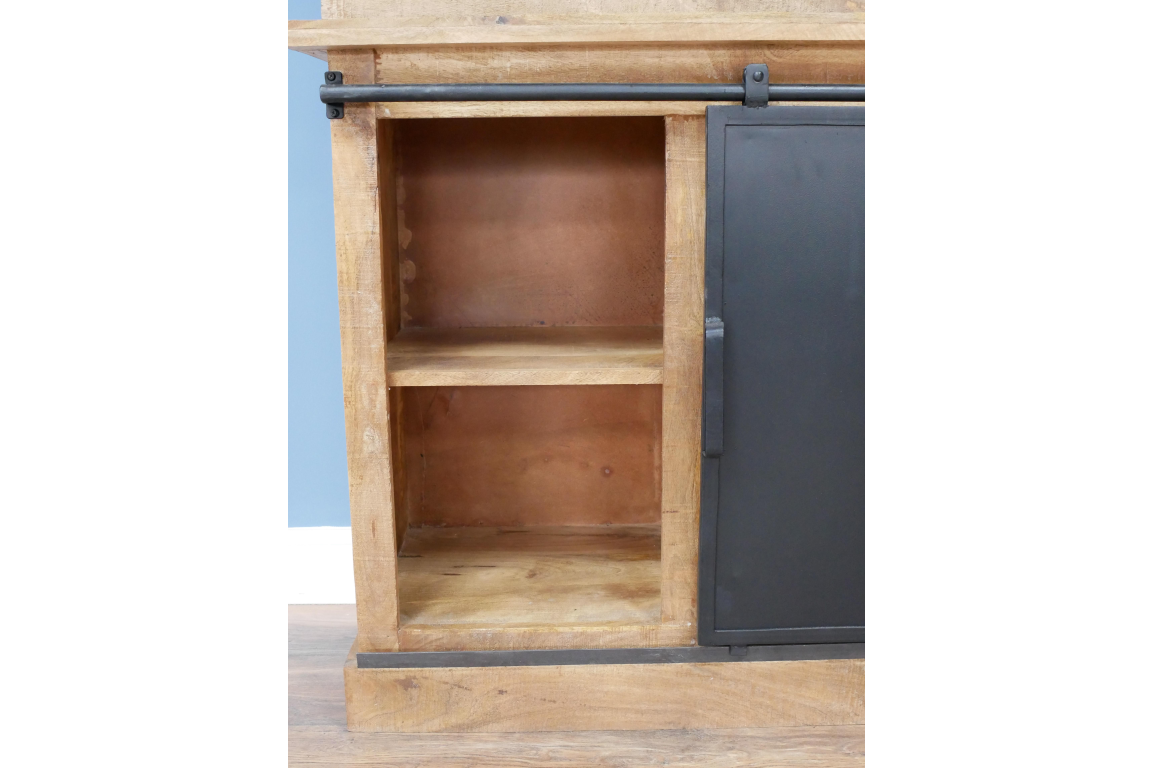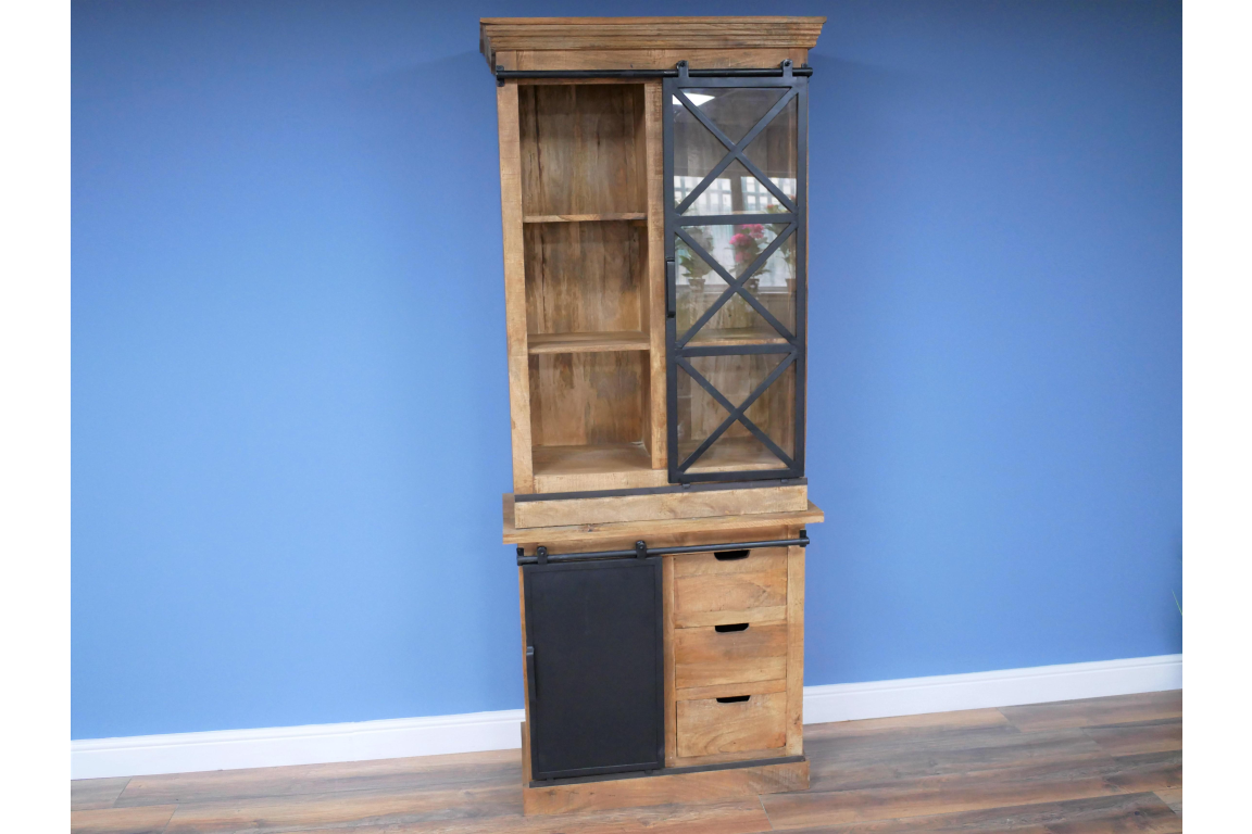 This Industrial Dresser Unit exudes a rugged charm with its blend of iron, glass, and mango wood. The sturdy iron frame provides a bold industrial look, while the glass panels add a touch of modern elegance. The warm tones and natural grain of the mango wood drawers bring a rustic feel to this piece, creating a versatile and stylish addition to any space.