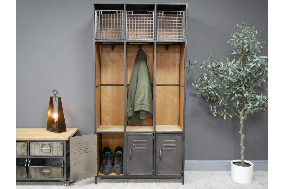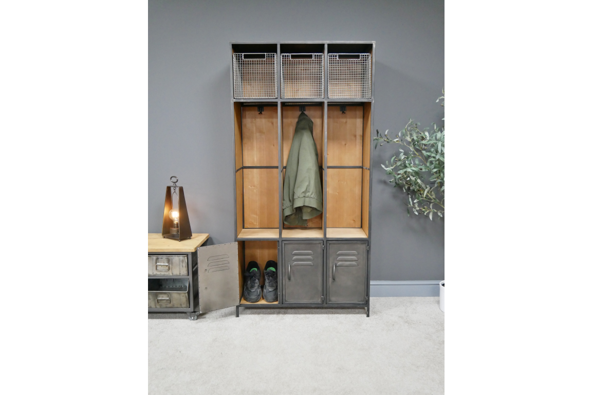 Crafted from sturdy metal and durable fir wood, this hall stand is not only visually appealing but also practical. The top surface provides ample space for displaying decor items or storing everyday essentials, while the lower shelves offer additional storage or display options. Whether used for holding keys and bags by the door or showcasing plants and photographs, this Industrial Hall Stand is a versatile piece that enhances both style and organization in your living space.