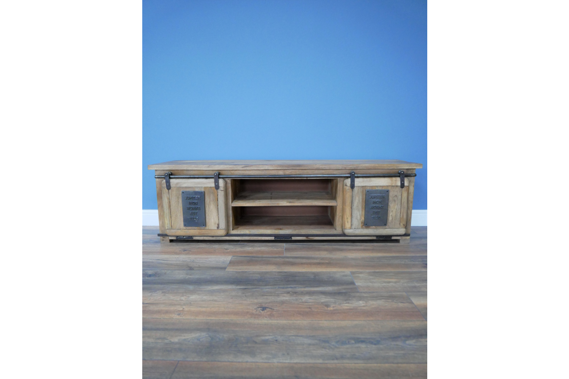 The Jupiter Industrial TV Cabinet combines a rugged industrial style with a touch of rustic charm, making it a standout piece in any living room or entertainment area. The sturdy iron frame exudes a raw, urban vibe, while the warm tones and natural grain of the mango wood add a sense of warmth and character to the overall design.