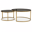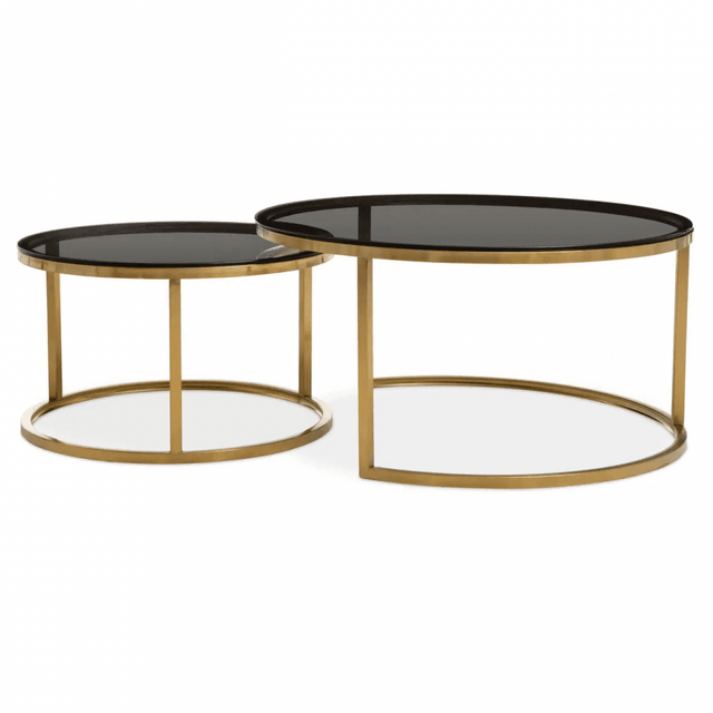 The Elara Set Of 2 Tables showcases stainless steel frames with a brushed gold finish and grey tempered glass tops in a stacking design, blending stylish and contemporary elements for versatile use in various settings.