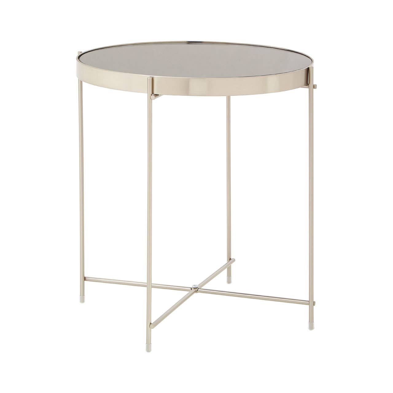 Elevate your space with our Grey Mirrored Side Table. This contemporary piece features a stylish grey mirrored top framed by brushed nickel metal, resting on sleek tubular legs for a modern look. Perfect for adding a touch of sophistication to your living room or bedroom, this side table effortlessly blends with upscale decor, making it an ideal choice for those aiming to create a boutique hotel-inspired ambiance in their home.