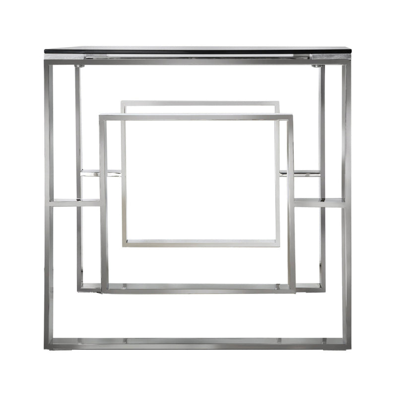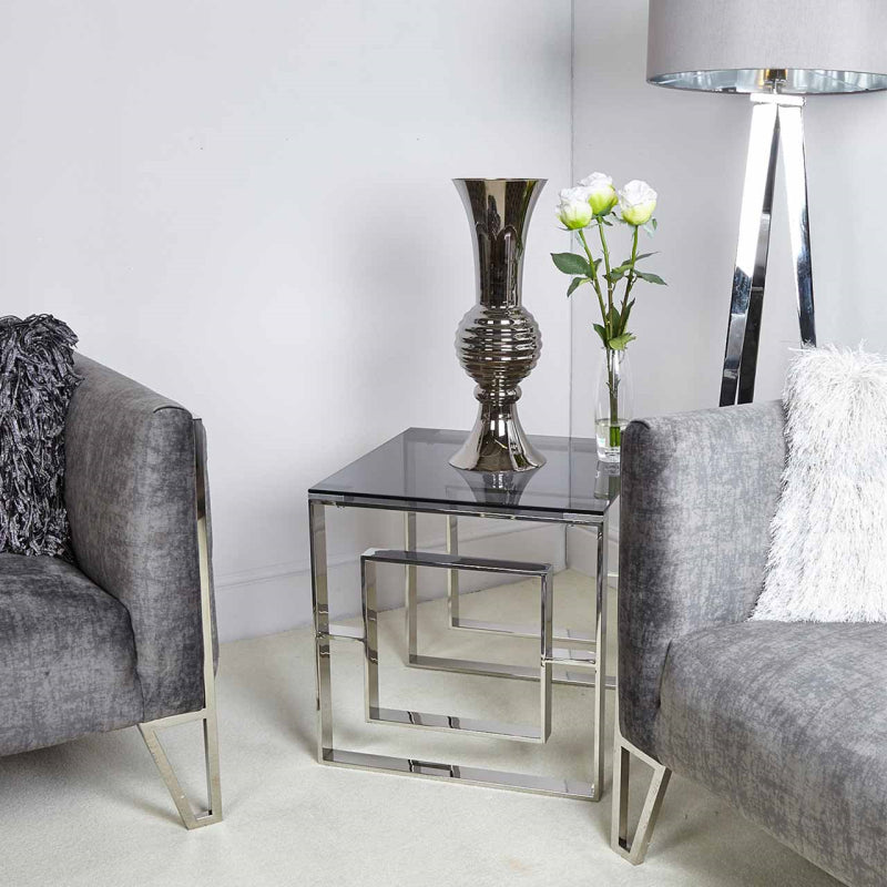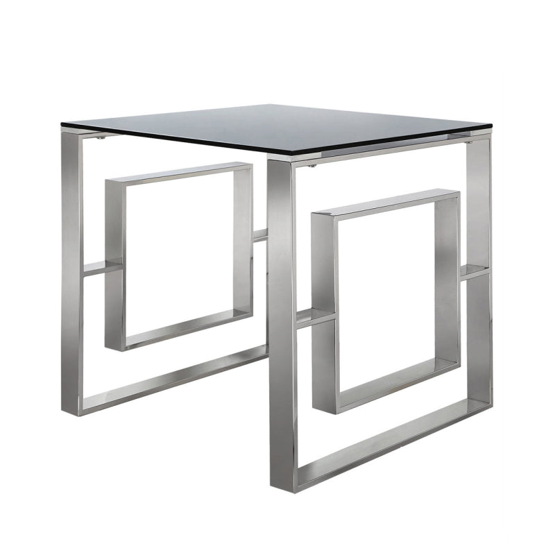 Elevate your living space with the Apex Stainless Steel End Table, a stunning fusion of contemporary design and elegance. Its striking geometric frame in a lustrous chrome finish perfectly complements the tempered smoked glass top, making it an ideal accent for any room. Whether used as a lamp table, bedside stand, or an occasional piece, this table effortlessly enhances your decor while providing both style and functionality.