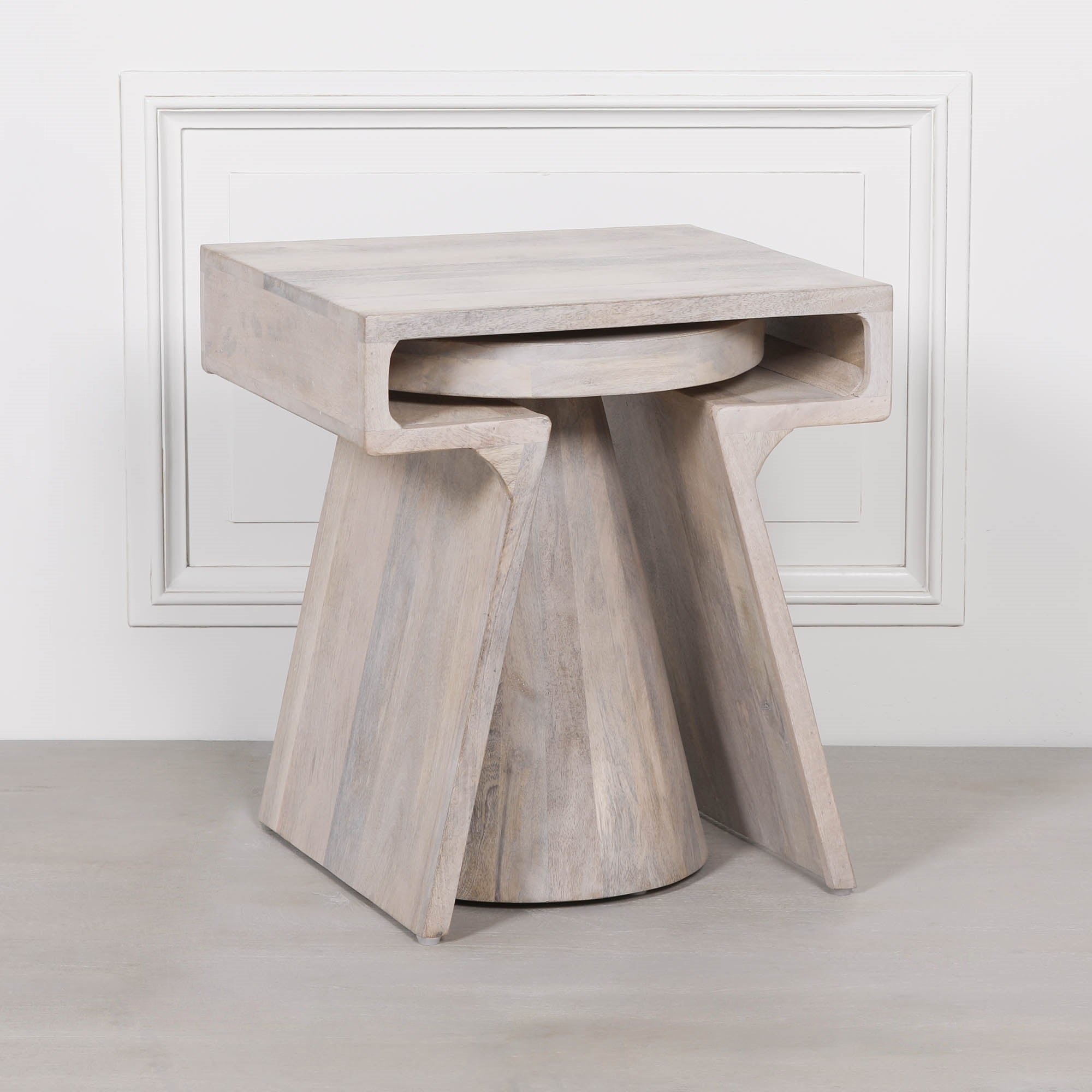 This Blanchie wooden nesting set of 2 side occasional tables is crafted from mango wood in a stunning Blanchie finish. The outer table measures H58.5 x W53 x D45.5cm, while the round table is H55.5 x dia. 45cm. Perfect for adding a touch of natural elegance to your living space.