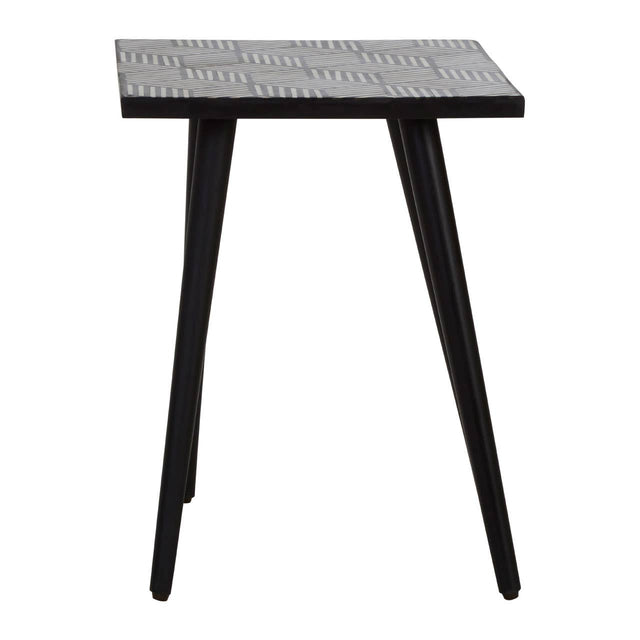 Elevate your space with our Boho Bone Inlay Side Table, expertly handcrafted with a black metal angular base and a chic acacia wood tabletop featuring intricate bone inlay detailing. The splayed legs add a touch of modernity to this minimalistic piece. Perfect for complementing other boho furniture items, this side table is a must-have for a stylish and coordinated home decor.