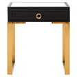 The Cordoba Black Shagreen Side Table features black shagreen leather with gold finish handle and legs. Its knocker style drawer handle adds a touch of durability and sophistication, making it a perfect addition to contemporary interiors.