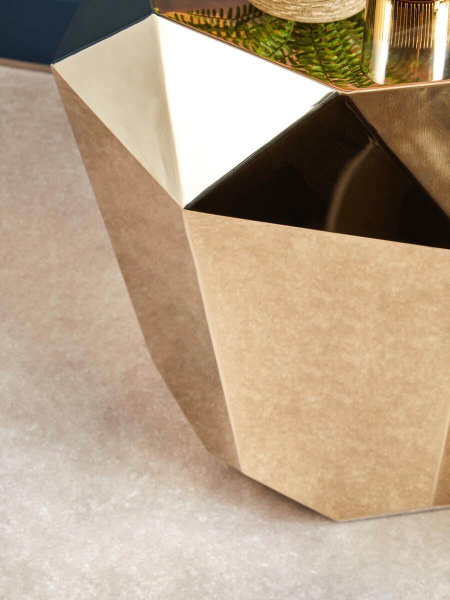 Featuring a captivating diamond-cut design, the Champagne Gold Diamond End Table is a luxurious piece that will elevate your living space. Crafted from stainless steel, this end table boasts a hexagonal tabletop supported by a tapered base with intricate triangular shapes. The reflective champagne gold finish adds a touch of elegance, making it a perfect statement piece for any modern home. Elevate your interior decor with this exquisite and stylish end table.