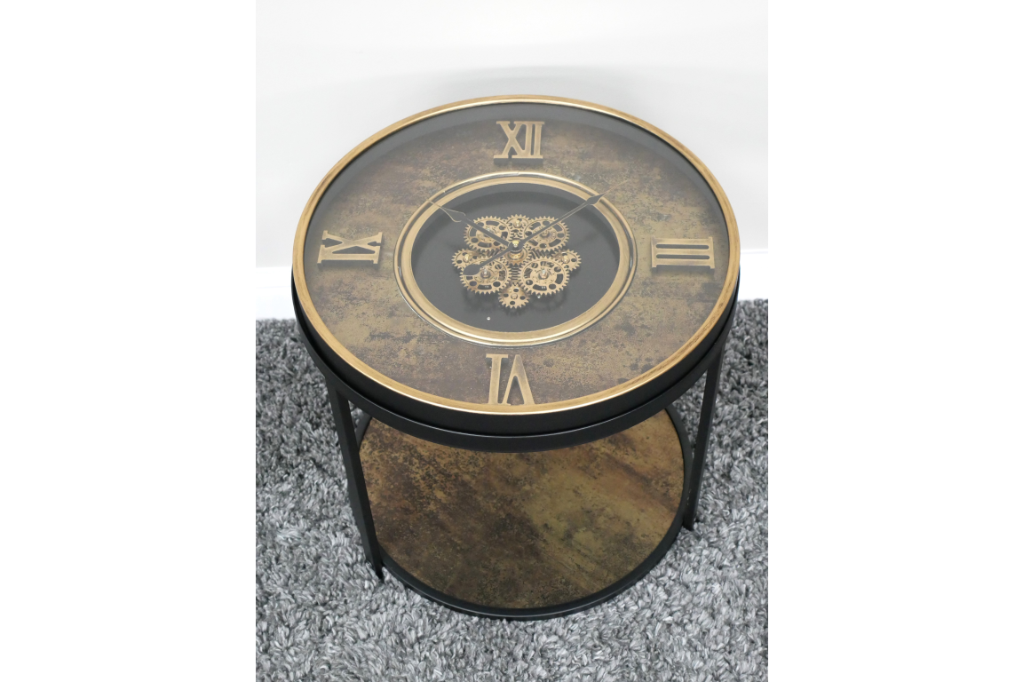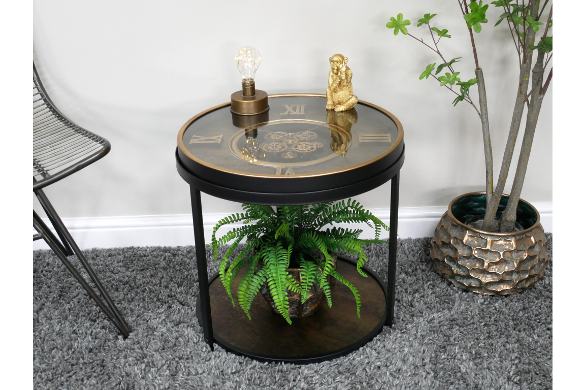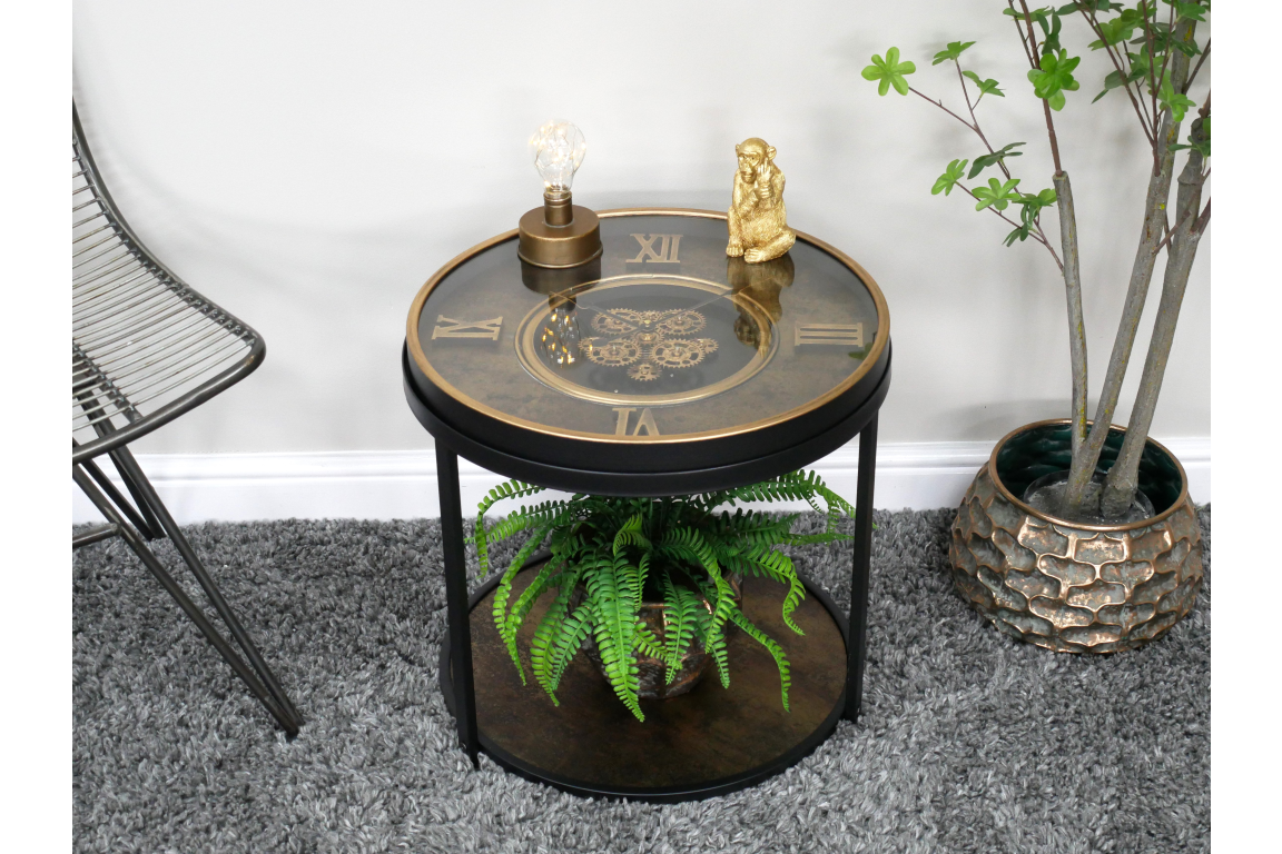 Crafted with a sturdy metal frame and a durable glass top, this side table is not only a statement piece but also a practical addition to your living space. Whether used as a bedside table, end table, or accent piece in your living room, this clock with cogs side table will add character and personality to your home decor.