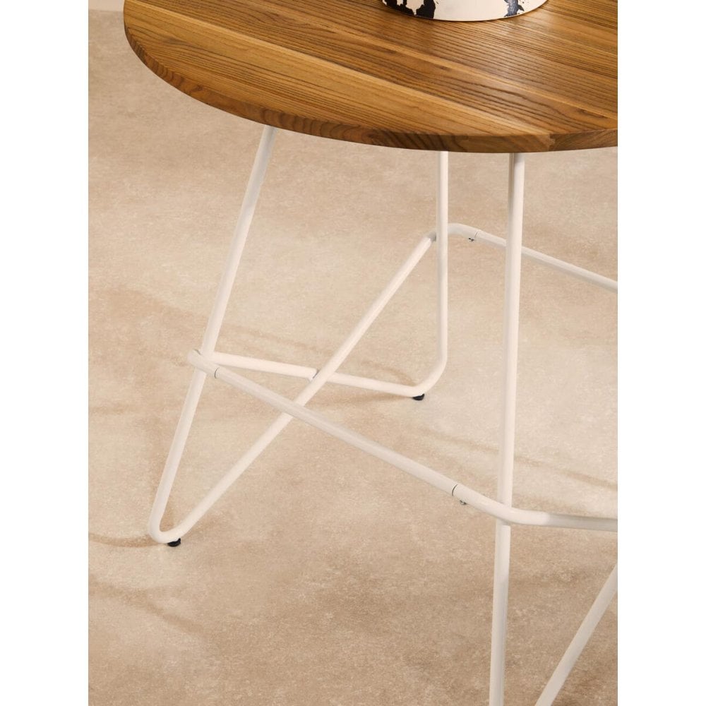 The Diston White Metal Round Table offers a blend of natural elm wood and sleek white metal. Its interlinked legs and smooth surface bring a New York loft style to your home, adding a touch of luxe and contemporary charm.