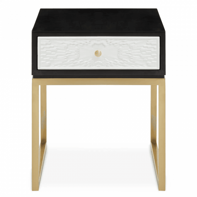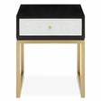 The Dumont One Drawer Side Table boasts a stainless steel frame with a warm metallic finish, decorative texture, and a gold knob handle. Its sledge base design offers both style and functionality for modern living spaces.