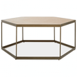 The Terrence Hexagonal Brown Coffee Table features an oak veneer wood top, brushed brass steel frame, and minimalist hexagonal design, offering a contemporary touch with functional steel durability.