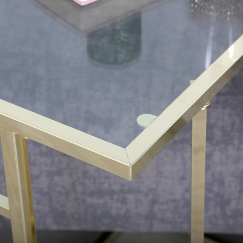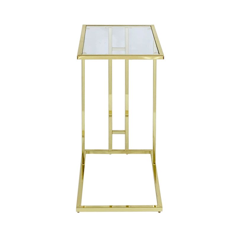 The Harry Gold Metal Sofa Table embodies the essence of modern elegance, seamlessly blending functionality with a striking aesthetic. Its sleek gold-finished base supports a clear toughened glass top, creating a sophisticated focal point for any living space.