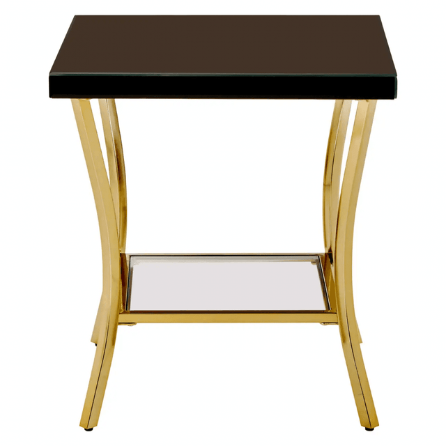 The Lancaster Townhouse Black Mirror Side Table offers a luxe design with curving iron legs and a reflective gold finish. Its glossy black top provides both functionality and aesthetic appeal.