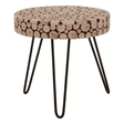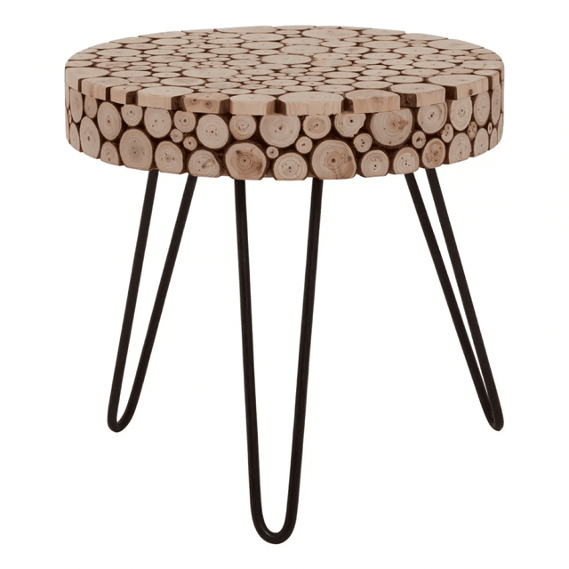Crafted from distressed fir wood with cutout discs and hairpin legs, the Aurelia Round Side Table embodies mid-century modern charm. Its unique design and materials make it a standout piece for eclectic interiors.
