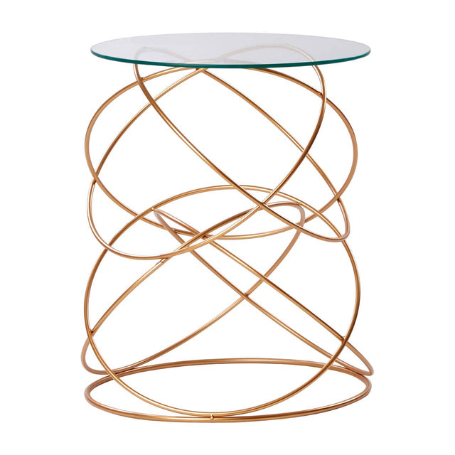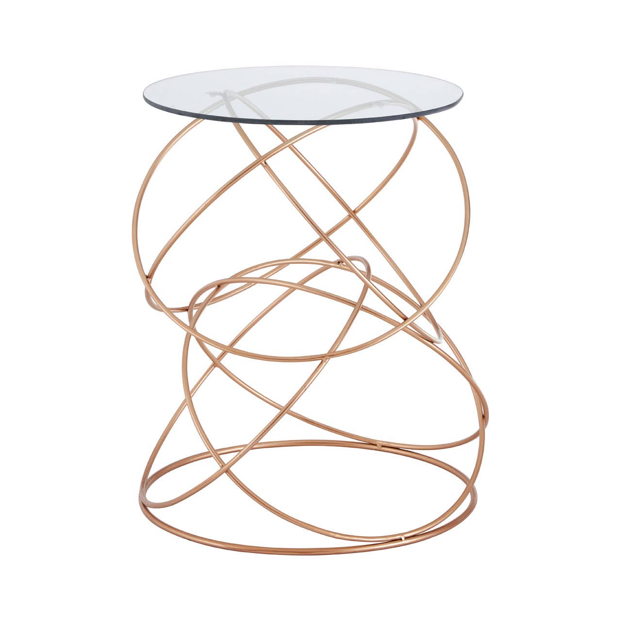 Elevate your decor with the Lexa Circles Table in stunning rose gold. Crafted from durable iron, this exquisite accent table boasts an intricate frame that holds a tempered glass tabletop with invisible suction cups. Perfect for Boutique interiors, this table adds a touch of elegance to any room.