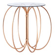 Elevate your space with the stunning Lexa Convex Table. Finished in luxurious rose gold, this piece exudes sophistication and warmth. Its unique design makes it a perfect statement piece that pairs beautifully with gold and silver accents for an elegant touch. Add a touch of glamour to your home with this eye-catching accent table.