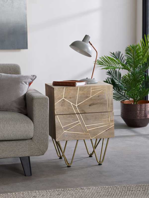 This exquisite Light Gold 2 Drawer Side Table is a stunning addition to any contemporary living space. Boasting two spacious drawers with intricate metal inlays on the fronts, this side table exudes elegance and style. The light natural finish enhances the beauty of the solid mango wood, while the gold metal legs add a touch of luxury. The modern design, with its abstract metal inlay on wood, elevates the artistry of furniture-making to new heights. The retro vintage look is accentuated by the angled metal legs, making this piece a true standout.