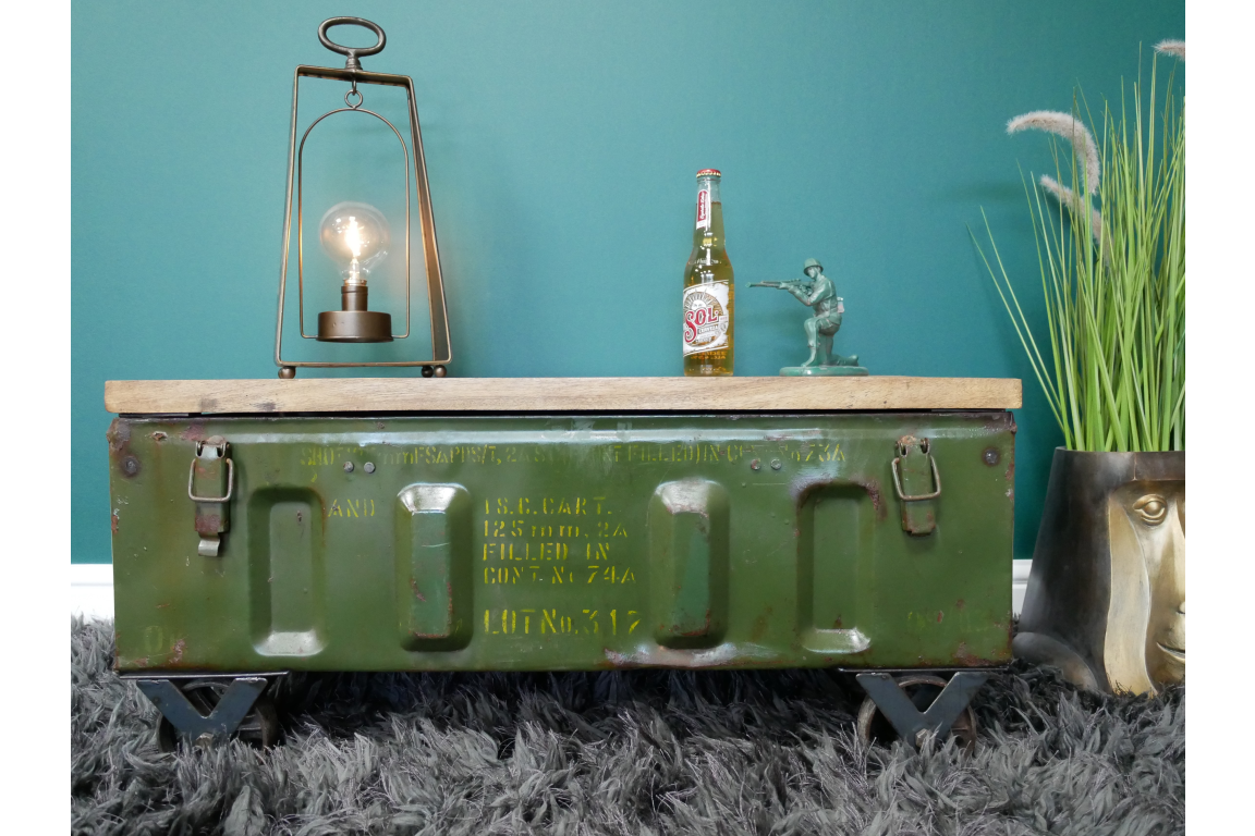 The table features a distinctive mango wood top, adding a natural and warm element to the otherwise robust design. Whether used as a coffee table in a cosy lounge setting or as a versatile side table in a bedroom or study, this piece brings a sense of adventure and heritage to your interior styling. Embrace the eclectic and unconventional with this military-inspired table that combines history, craftsmanship, and functionality in a truly captivating way.