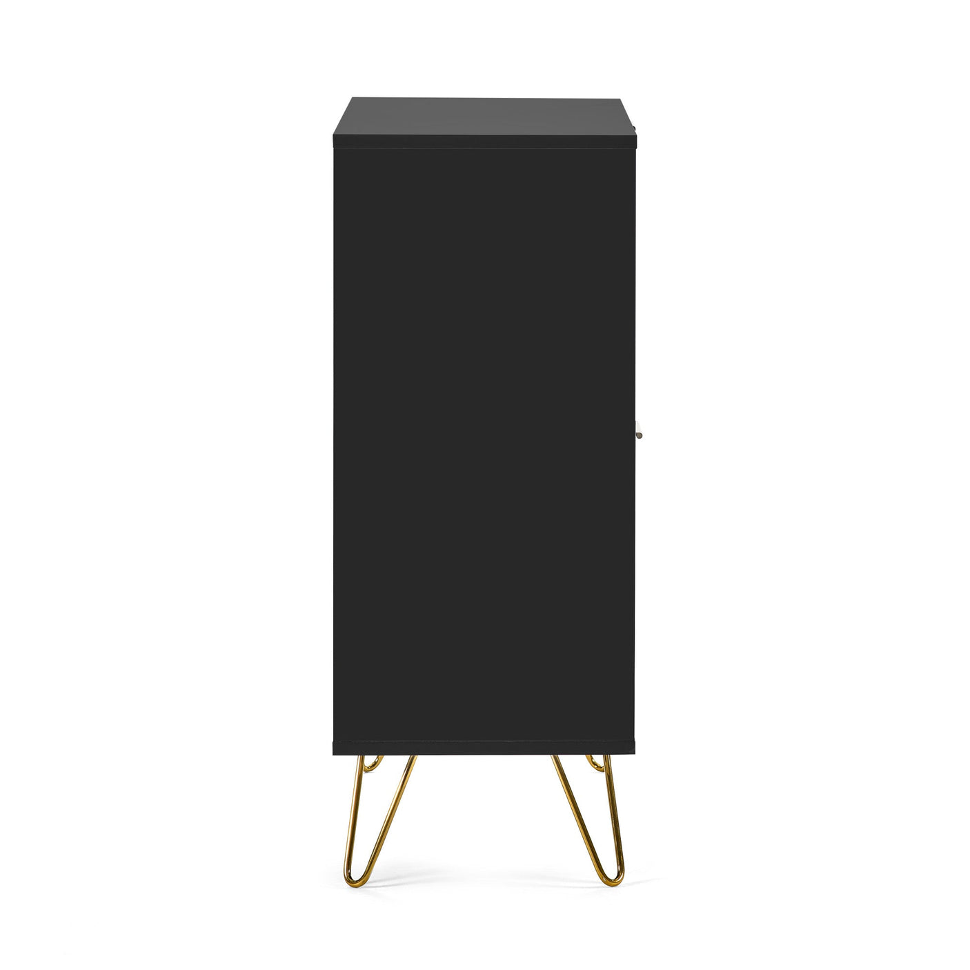 Elevate your space with the Murano 2-Door, 2-Drawer Sideboard, where chic design meets timeless sophistication. Finished in a sleek matte black and adorned with exquisite brushed gold accents, this piece exudes luxury and contemporary flair, effortlessly complementing any interior style. Featuring ample shelving space, along with two generously sized cupboards and two spacious drawers, it offers both practicality and elegance. With minimal assembly required, transform your home effortlessly and make a stylish statement.