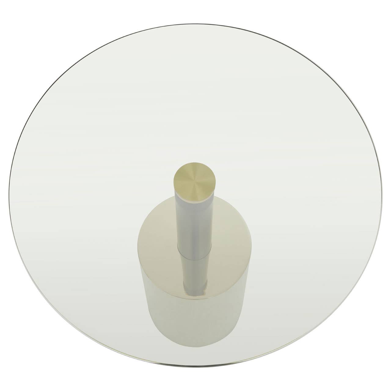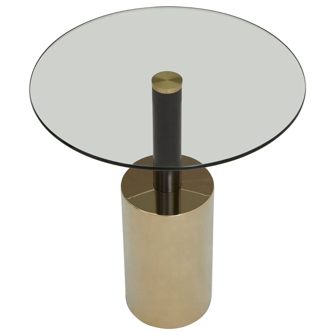 Discover sophistication with our Elegant Glass & Gold End Table. This contemporary piece features a round clear glass tabletop elegantly supported by a warm metallic gold stainless steel base. The pedestal form, connected by a sleek black metal frame, adds a touch of modern flair to any living space. Elevate your decor with this stylish and versatile end table.