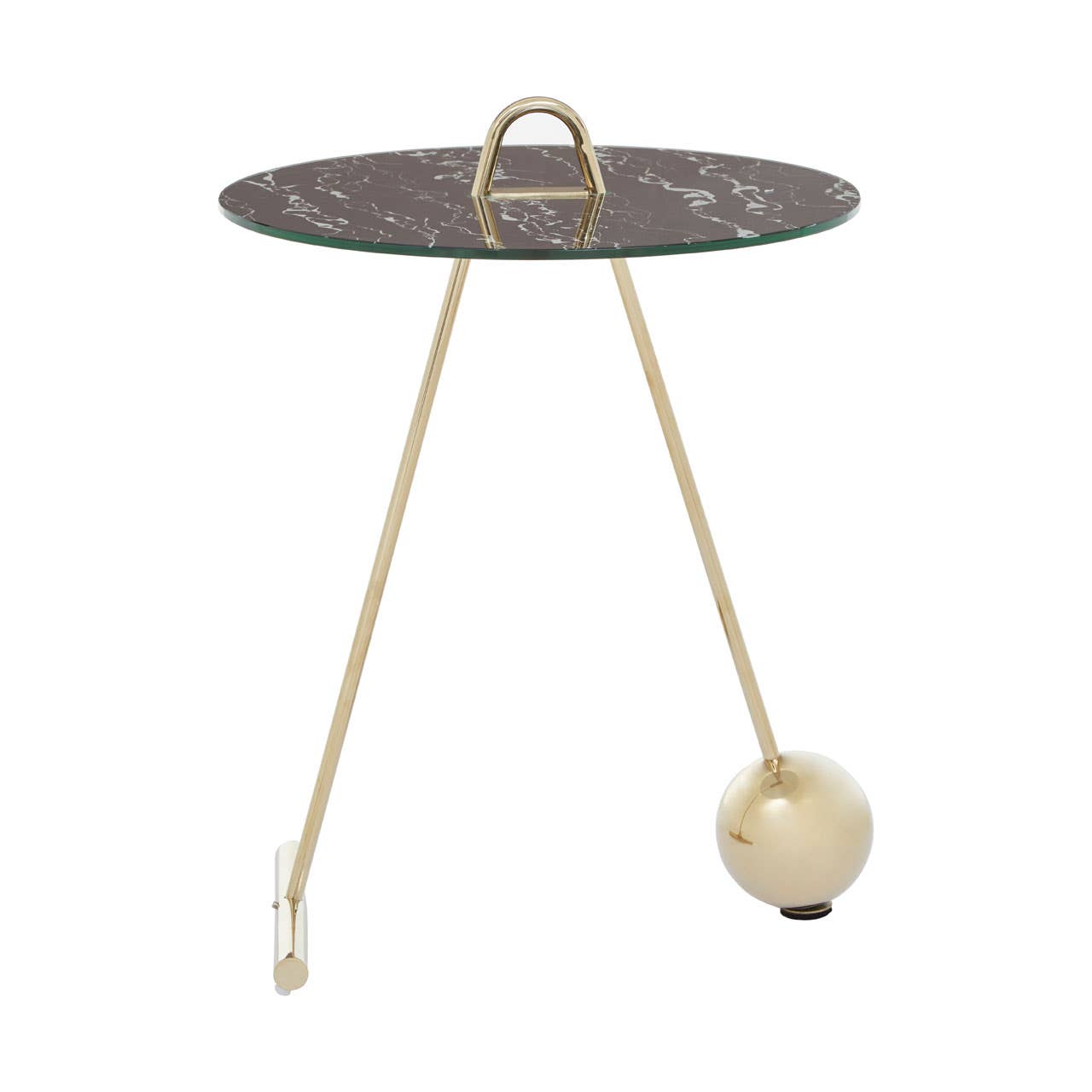 Elevate your space with the Golden Marble End Table. Featuring a sleek black glass marble effect top and striking angular gold legs, this modern piece adds sophistication to any room. The unique semi-circle design is sure to make a statement in your home.