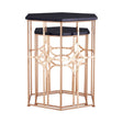 Elevate your living space with the Lexa Set of Two Side Tables. These hexagonal tables feature a sleek black finish on the tops that beautifully contrasts with the warm metallic frames. Designed to be nested, each table is equipped with small feet for added stability. Perfect for showcasing decor or resting your essentials, these side tables will complement any sofa or armchair effortlessly.