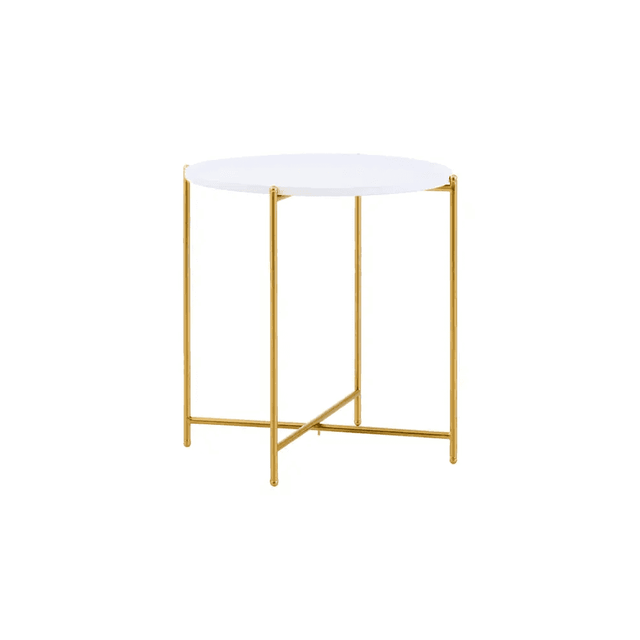The Orion White Top Side Table features a white tray top, crossed section base, and a sleek gold finish iron stand for a minimalist contemporary look.