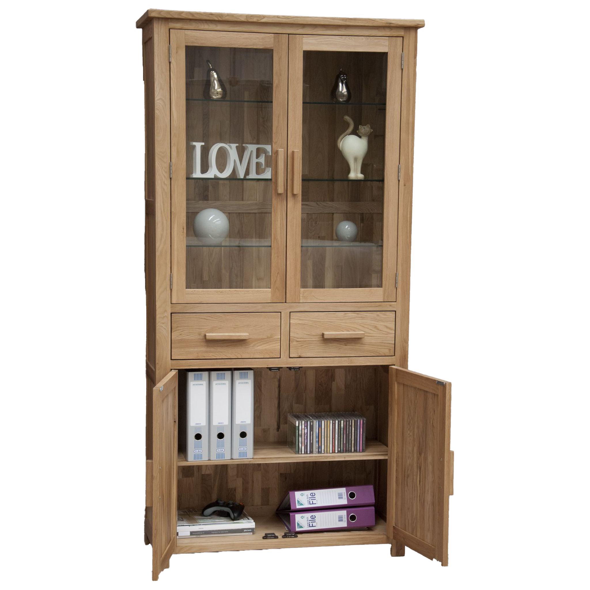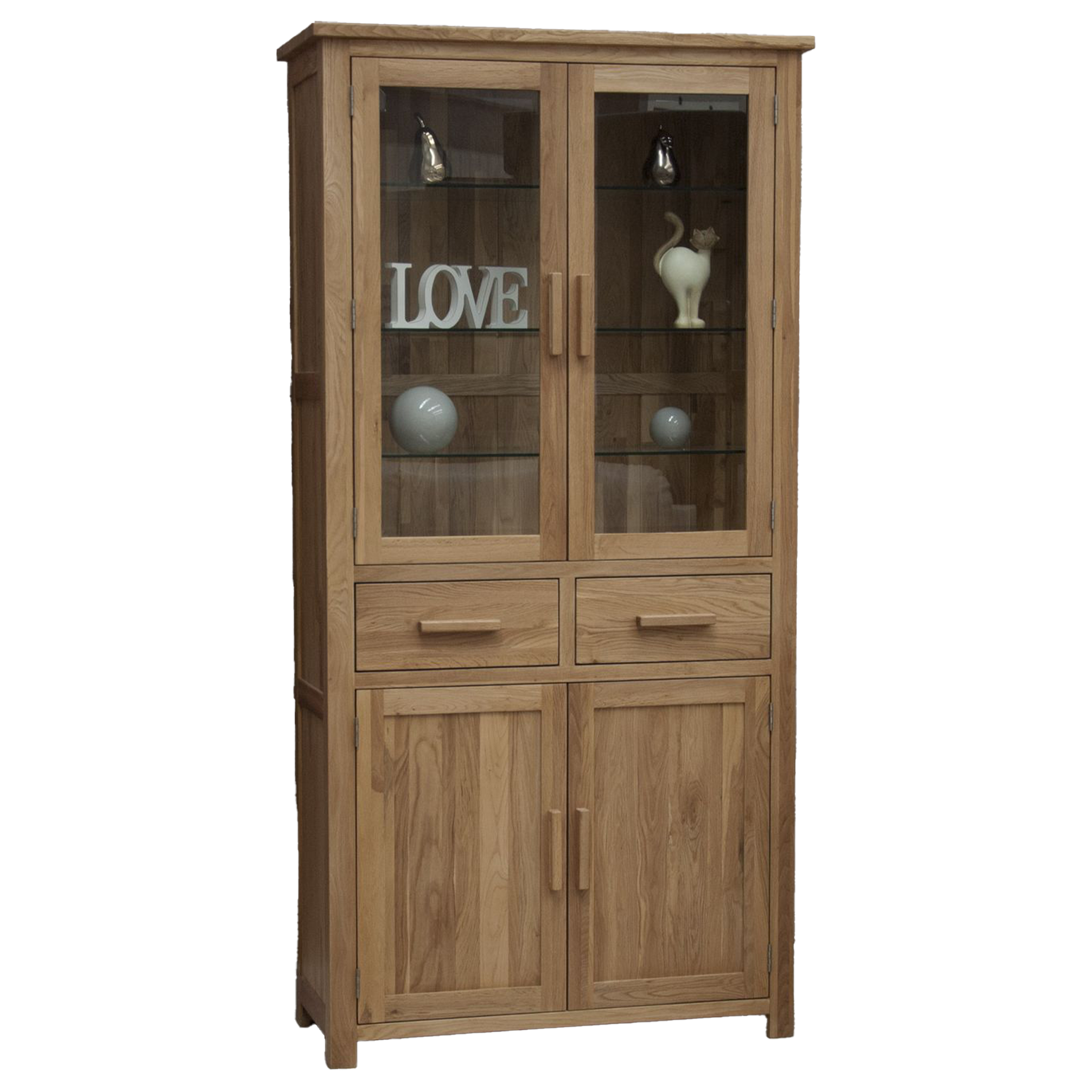 The Opus 4 Door Library Unit brings timeless elegance and functionality to your space. Crafted from 100% solid oak, this exquisite piece showcases your collectibles behind 2 glass-front doors while neatly concealing other items behind solid doors. With 2 dovetail drawers and adjustable glass & oak shelves, this unit offers ample storage to keep your space organised and stylish. The metal handles add a modern touch, or opt for additional oak handles for a classic look. Finished with a clear lacquer, this unit stands at 1900mm tall, 950mm wide, and 380mm deep, weighing 82kg.