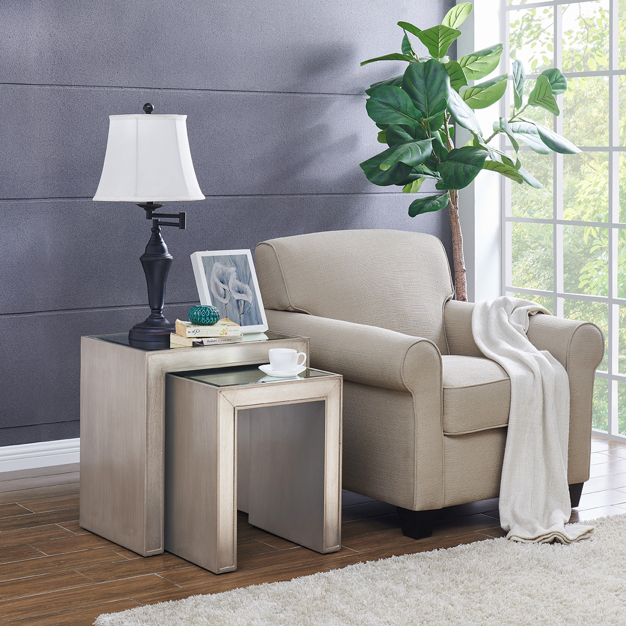 The Nova Nest of Tables offers versatile functionality and modern style for your living space. This set includes two individual tables with a sleek wood grain style finish that adds a touch of elegance to any room. The mirrored glass tops provide a contemporary look while also being easy to clean and maintain.