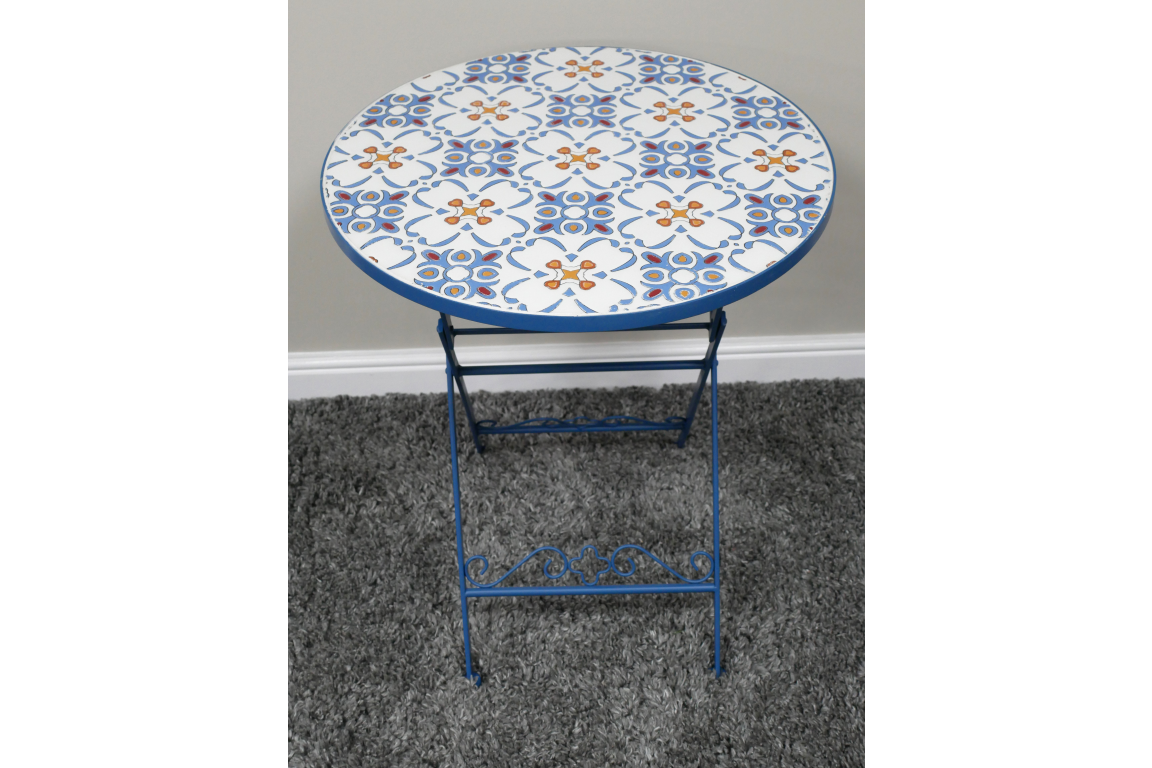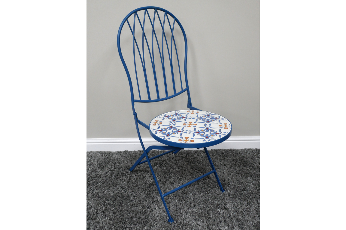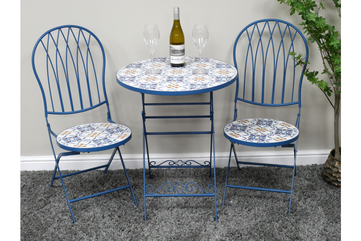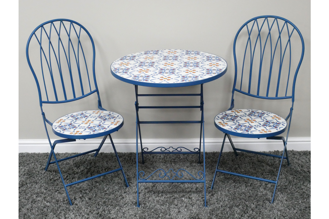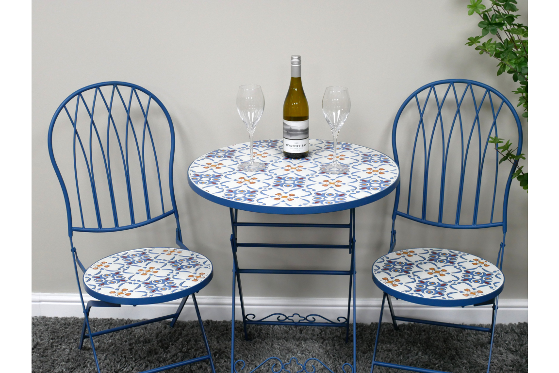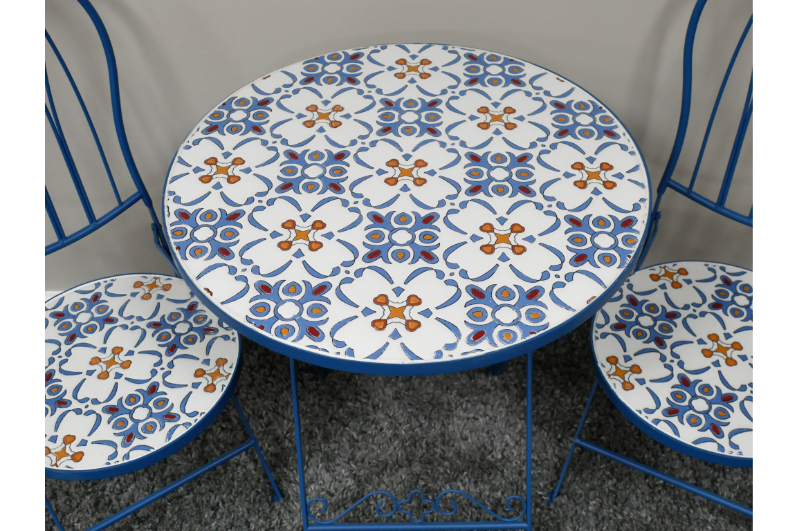 Crafted from durable metal and ceramic, this set is designed to withstand outdoor elements while adding a pop of colour to your outdoor decor. Whether you use it for al fresco dining, enjoying a cup of coffee in the morning sun, or simply as a decorative accent, this Mosaic Table & Two Chairs set combines functionality with a unique and eye-catching design.