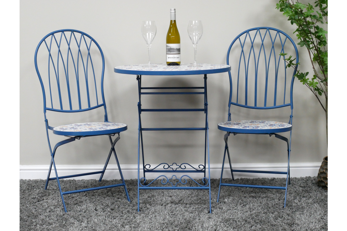 This Mosaic Table & Two Chairs set in a charming blue hue brings a touch of Mediterranean flair to your outdoor space. The intricate mosaic tile design on the tabletop and chair backs adds a whimsical and artistic touch, creating a beautiful focal point for your garden or patio. The curved metal frames of the chairs provide a comfortable and stylish seating option, perfect for enjoying a leisurely afternoon tea or a relaxing outdoor meal.