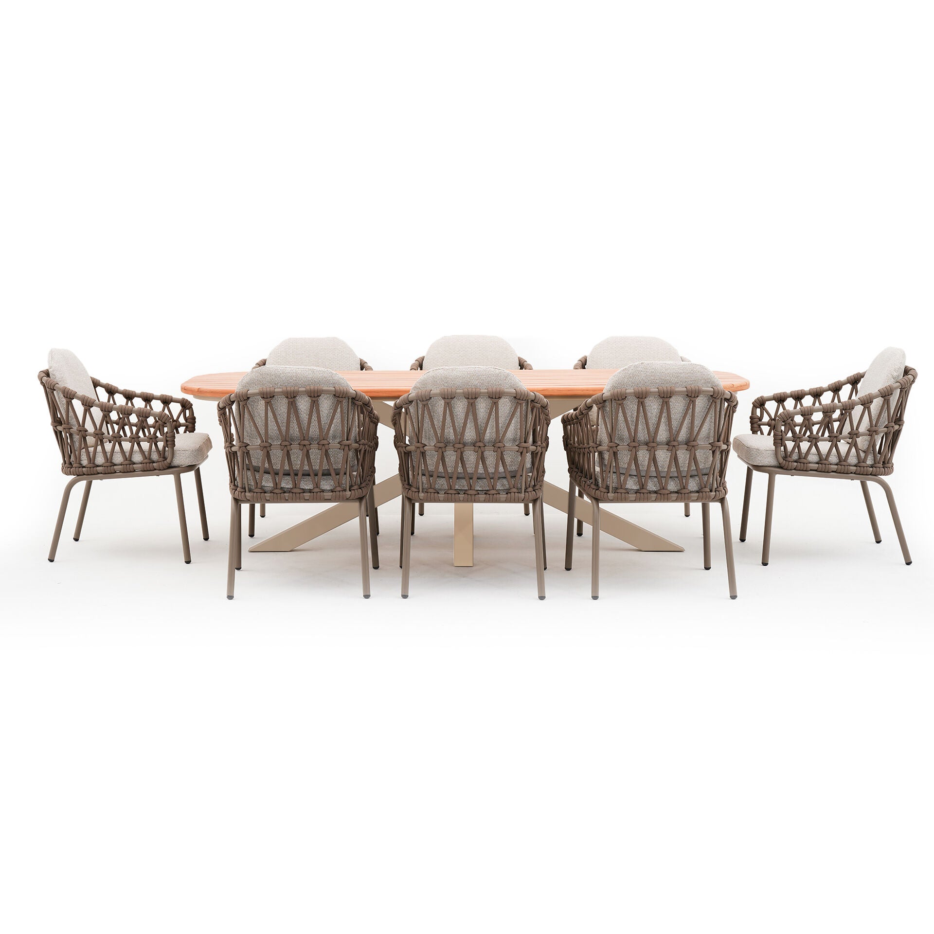 Elevate your outdoor dining with the Sicily 8 Seat Rectangular Table with Rope Chairs in Latte. Designed for luxurious alfresco entertaining, this set comfortably accommodates eight guests, offering a blend of style and durability. Crafted with a solid FSC certified Teak tabletop and a powder-coated aluminium frame, this set exudes timeless elegance. The handwoven polyester rope chairs in a soothing Latte hue, paired with shower- and stain-resistant cushions, provide both comfort and sophistication, making it a perfect addition to modern outdoor spaces.