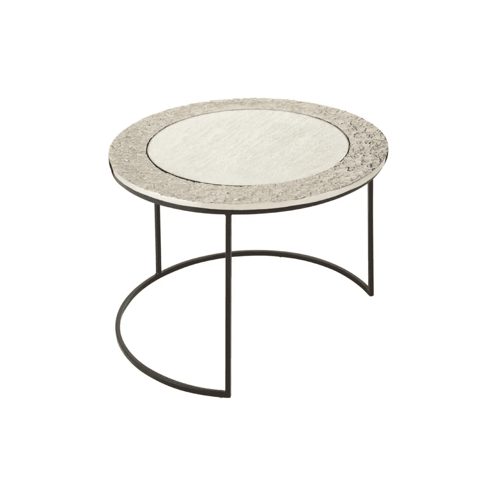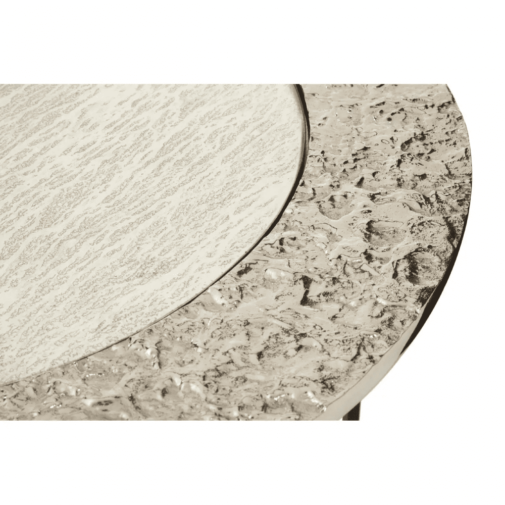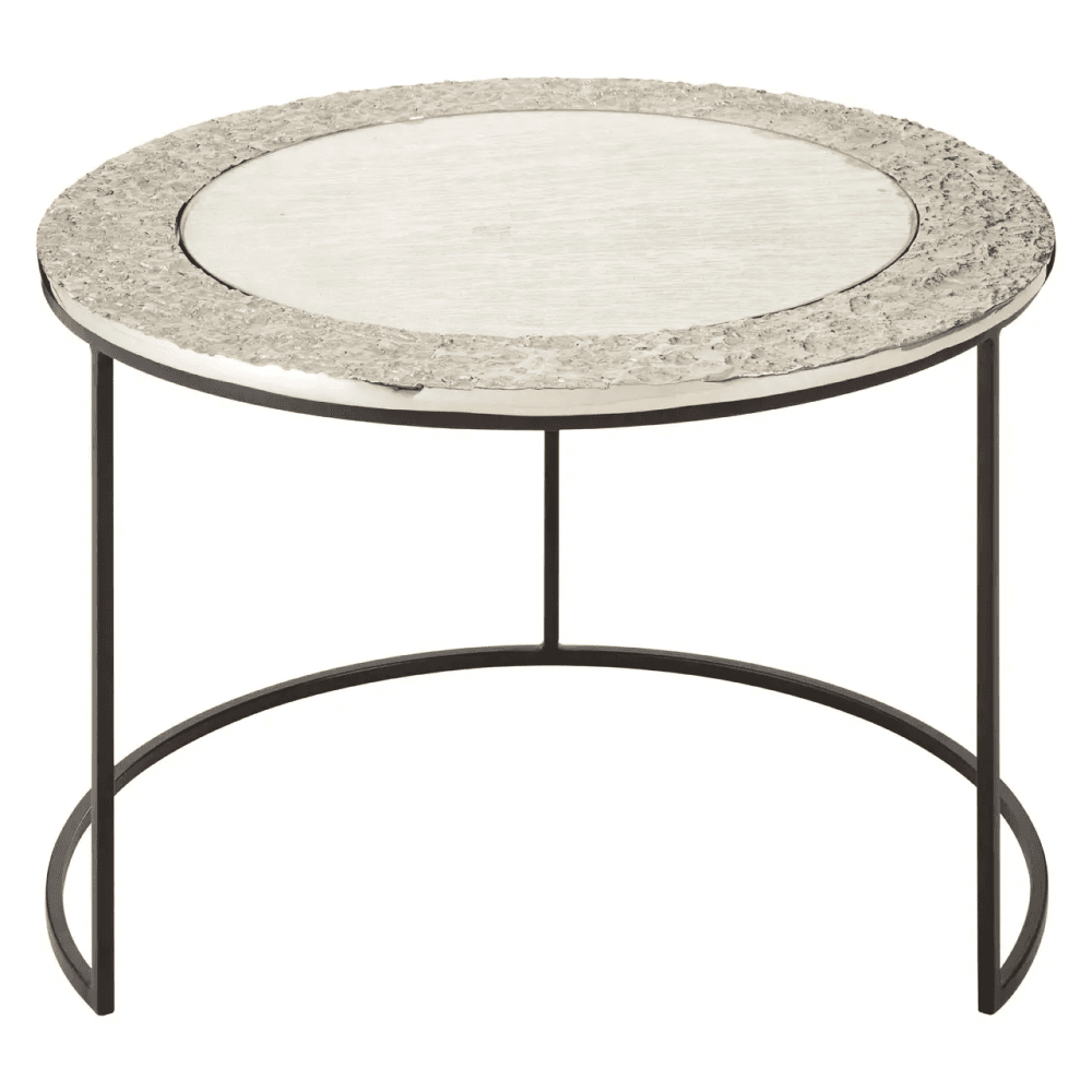 The Varese Set Of 2 Large Round Side Tables offers handcrafted metallic brass finish with antiqued glass tops, combining functional aesthetics in a versatile design that complements various interior styles.