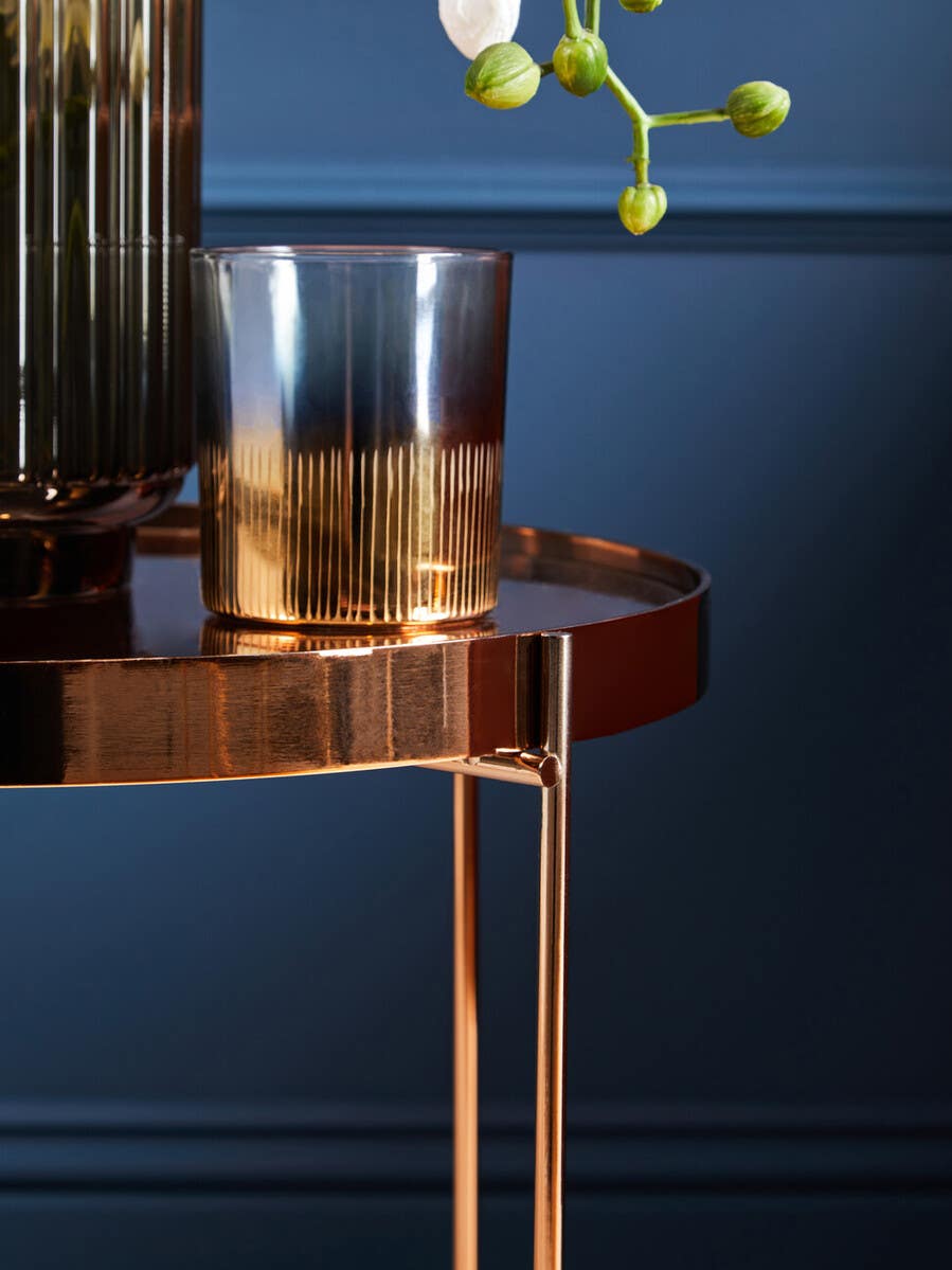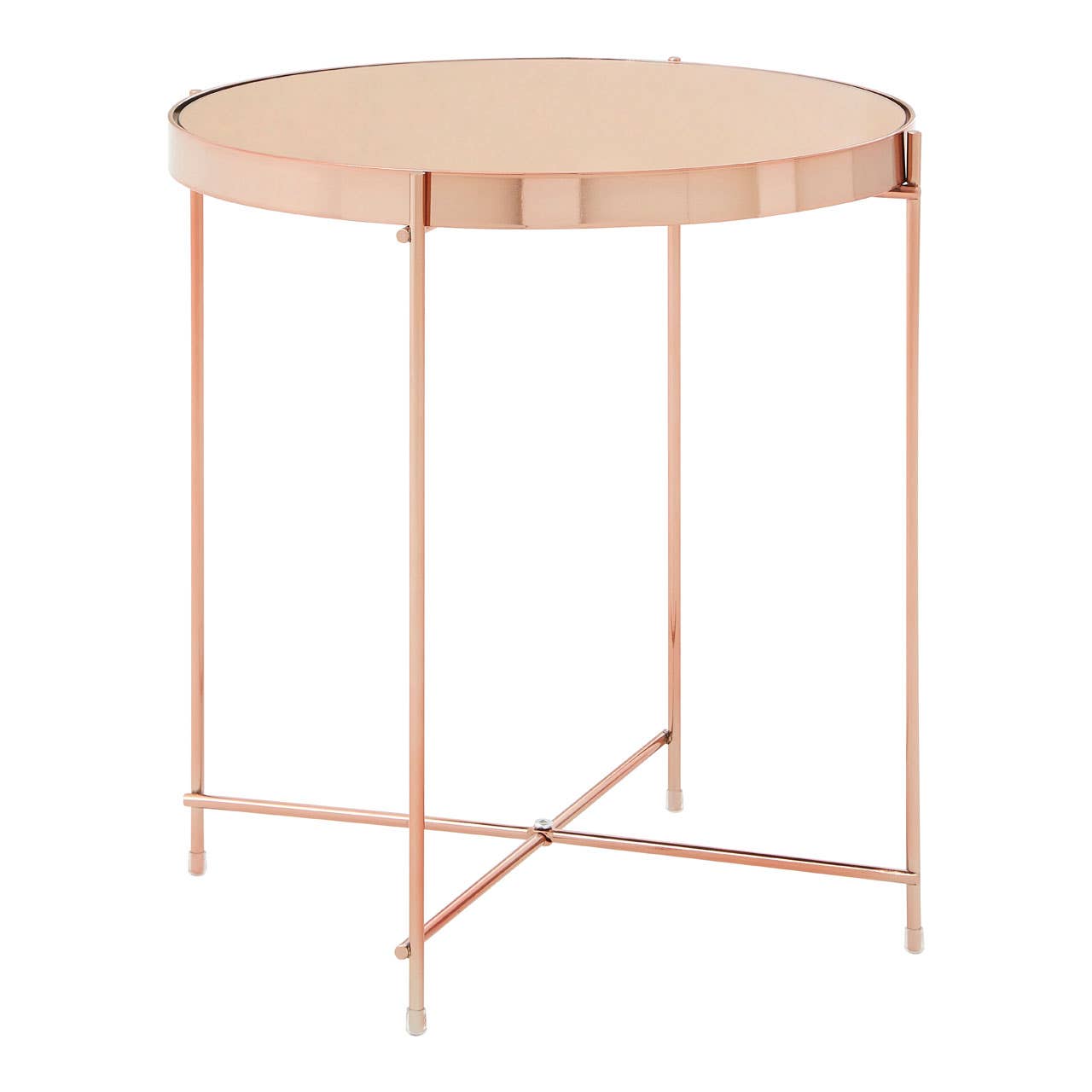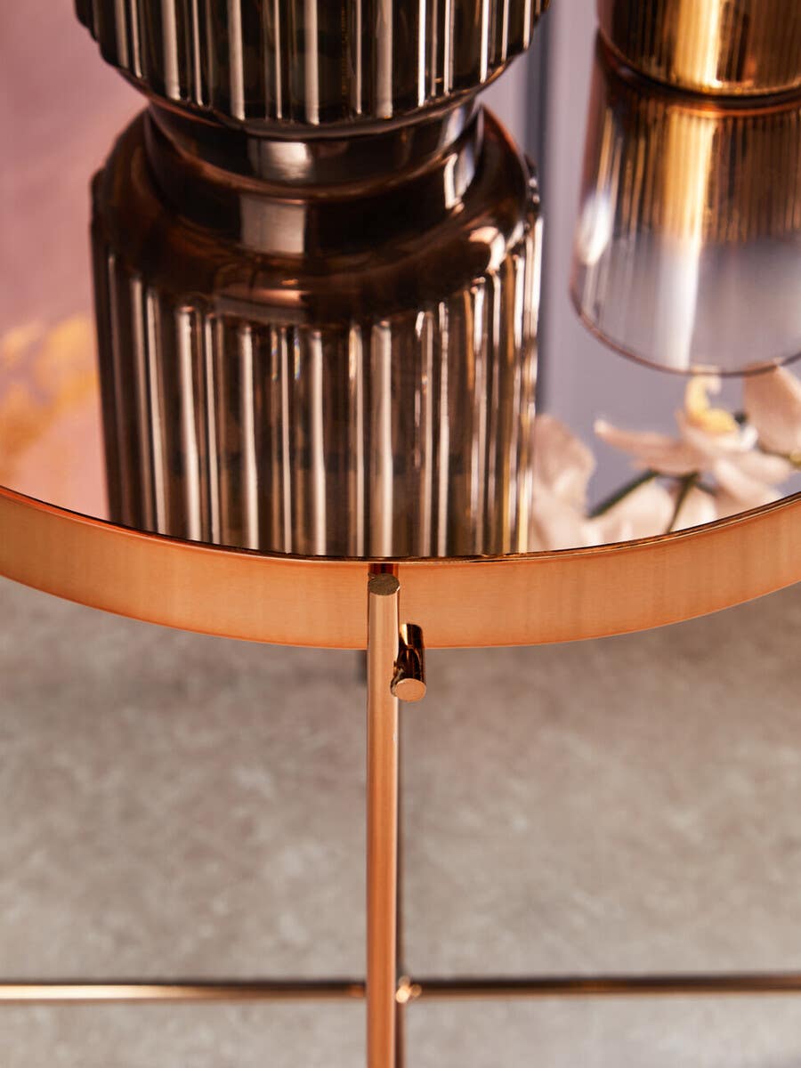 Elevate your space with this chic Pink Mirror Side Table. Featuring a stunning pink mirrored top and elegant rose gold metal band, this table exudes glamour and sophistication. The sleek design with slim tubular legs adds a touch of modern minimalism, making it a perfect addition to your boutique hotel-inspired decor.
