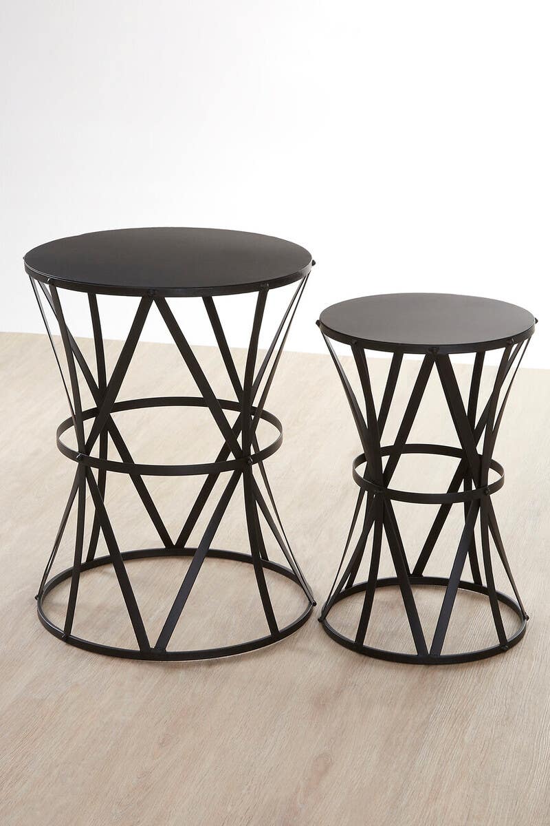 Elevate your living space with the Avantis set of 2 side tables. Their unique cross design features vertical lines that create a gentle concave effect for a softer look. Crafted from iron, the smooth round tabletops boast industrial charm with their round stud detail along the rims. Add a touch of modern elegance to your home with these stylish and versatile side tables.