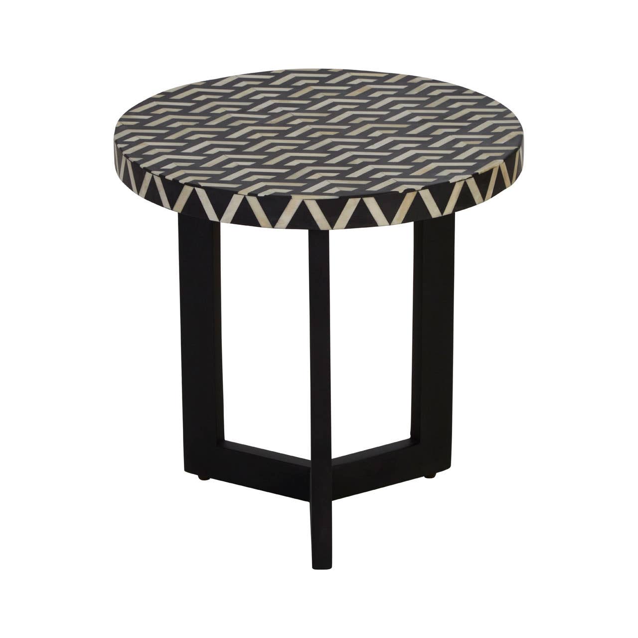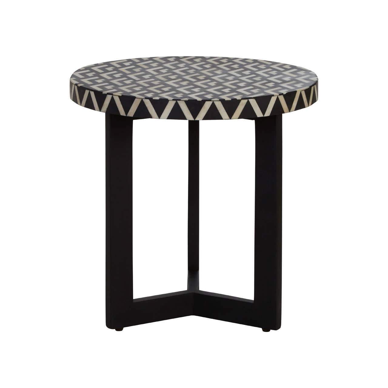 Handcrafted with care, this boho side table features a stunning acacia wood top with intricate bone inlay details. The sleek black metal base boasts a unique three-legged design, adding a touch of modern flair to any room. Elevate your space with this stylish and functional piece that seamlessly blends bohemian vibes with contemporary elegance.