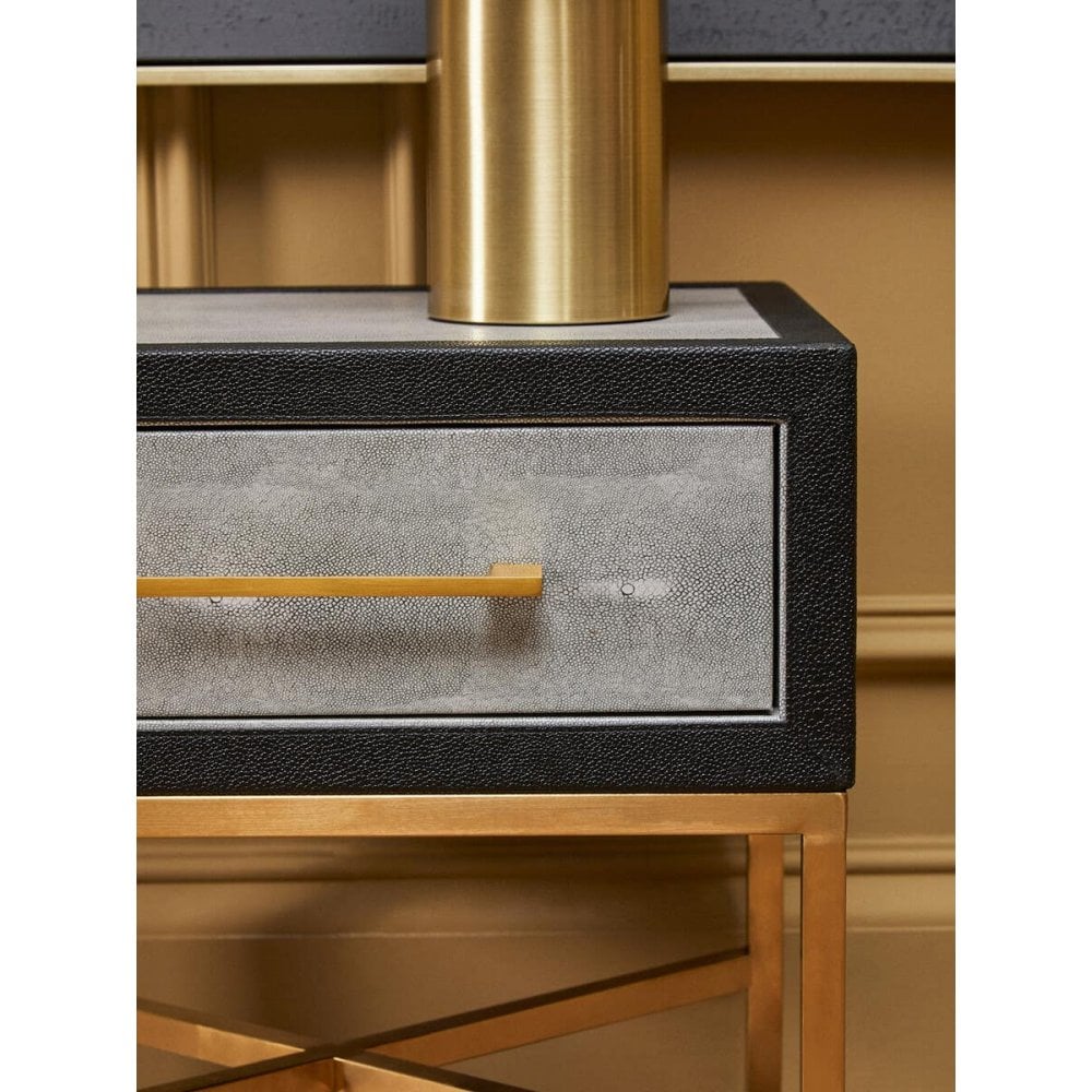 Discover the Cadence Grey Shagreen Side Table, featuring a grey shagreen top and brushed matte gold legs with a single drawer and black border. Its luxurious materials and sleek design make it a stylish addition to any modern interior.
