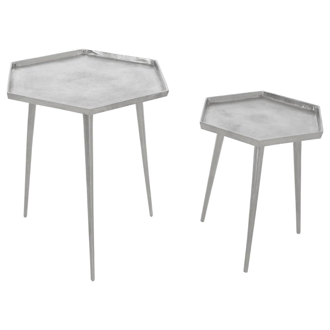 Enhance your living space with this chic pair of hexagonal side tables. The metallic silver finish and modern geometric design add a touch of sophistication to any room. Their versatile tray tabletops and elegant pointed legs make them a practical and stylish addition to your home decor.