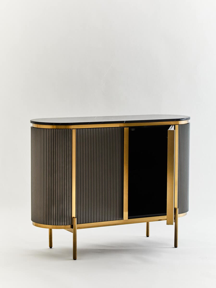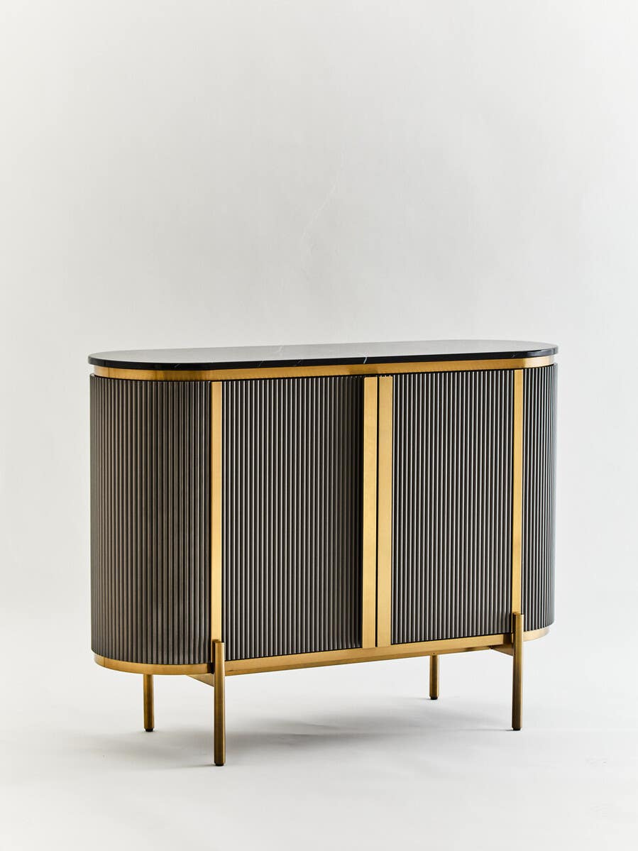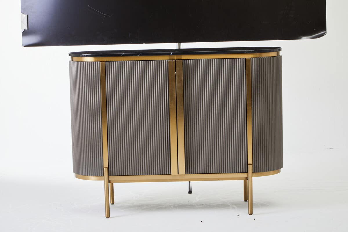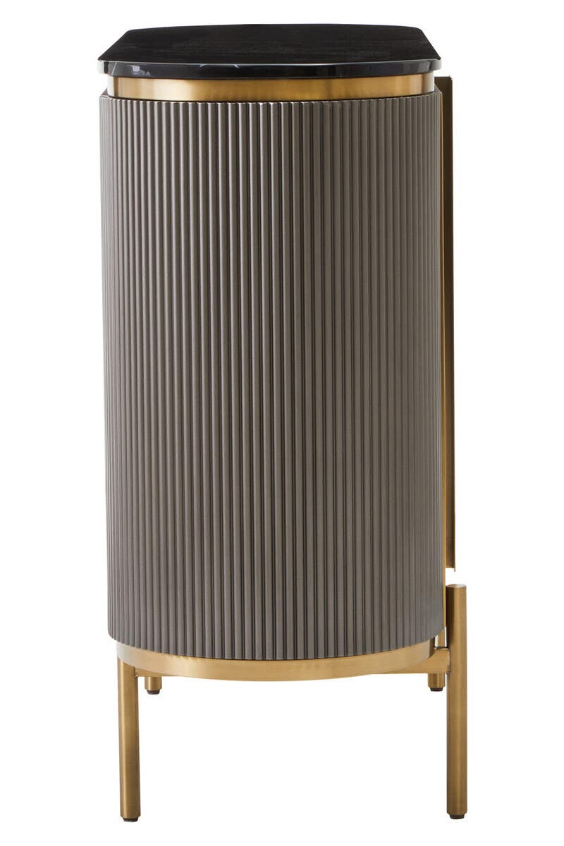 Elevate your living space with the Dervio Grey Two Door Sideboard. Featuring a sleek fluted design on its doors, a sophisticated black marble top, and opulent gold legs, this sideboard is a statement piece that seamlessly blends modern aesthetics with functionality. The contemporary design adds depth to any room while the slim metallic legs provide sturdiness. Organize your space in style with this luxurious sideboard that exudes elegance and charm. Ideal for those who appreciate fine craftsmanship and exquisite design, this piece is sure to be a focal point in your home.