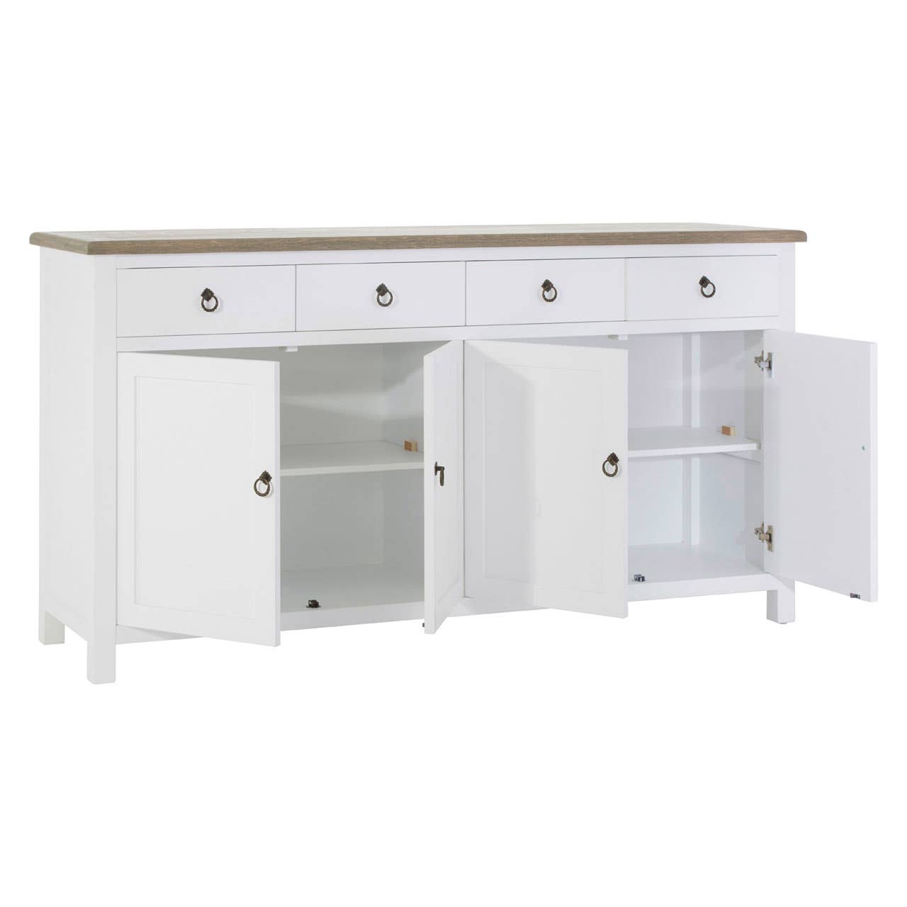 Enhance your dining room with the Hampstead White Oak Sideboard. This elegant piece features four sliding drawers under a sturdy oak wood tabletop, ensuring ample space for your table linens and cutlery. The sideboard's four cupboard doors open to reveal spacious storage, perfect for storing your fine china or glassware. Finished with sophisticated carved metal handles, this sideboard seamlessly blends style and functionality, making it a stunning addition to your home décor. Elevate your dining experience with the timeless charm of the Hampstead White Oak Sideboard.