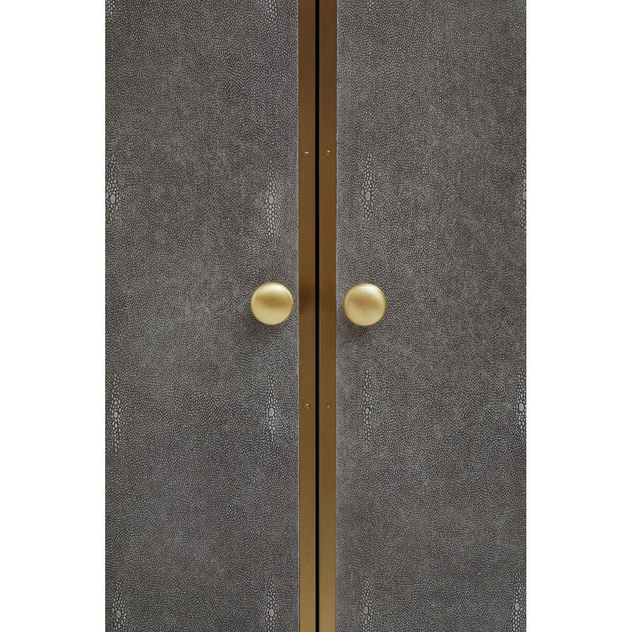 Elevate your space with our Luxury Shagreen Effect Cabinet featuring a captivating grey shagreen finish on its doors for a touch of opulence. The sleek design is complemented by a minimalist gold metal base that exudes sophistication and modern charm. This cabinet is not only a stylish statement piece but also offers practical storage behind its two doors. Add a luxurious touch to your home decor with this exquisite piece that seamlessly blends textures and materials for a truly elegant look. Ideal for those who appreciate quality craftsmanship and unique design.
