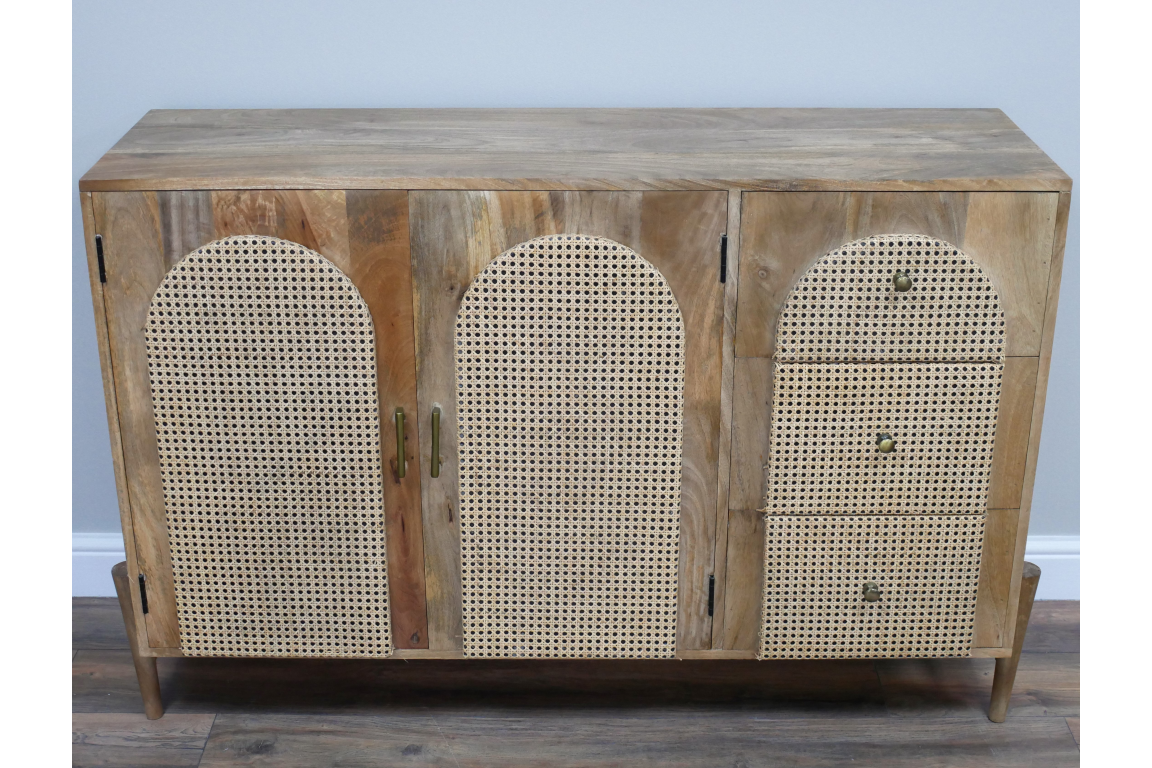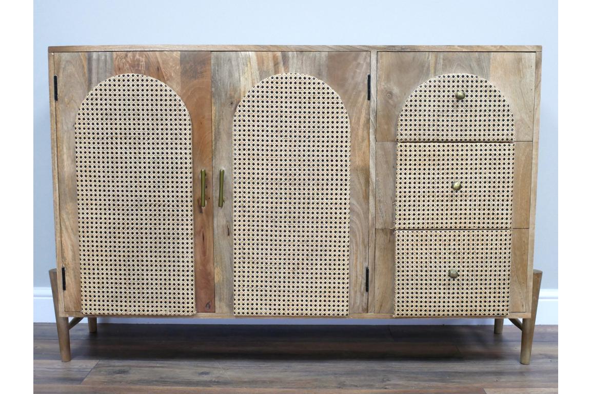 This ex-display rattan sideboard exudes a charming and rustic style, perfect for adding a touch of warmth to any living space. The natural rattan material gives it a timeless and elegant look, while the intricate weaving adds a unique texture that is both eye-catching and stylish. Its versatile design allows it to blend seamlessly with a variety of interior decor styles, from bohemian to coastal, making it a perfect statement piece for any room.