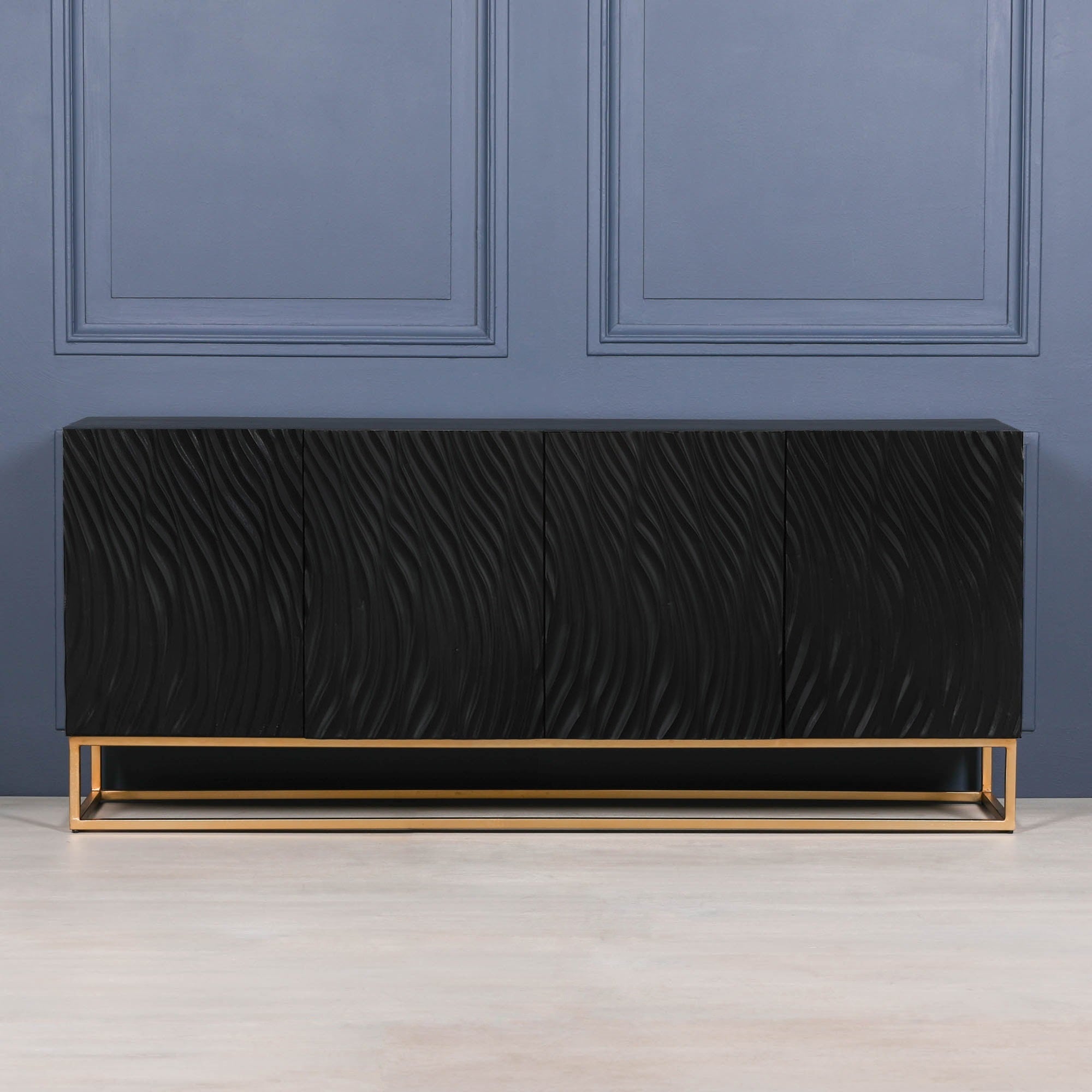 Introduce a touch of elegance and sophistication to your living space with this stunning black painted sideboard. Featuring a contemporary ripple/wave effect pattern on the front doors, this piece adds a stylish focal point to any room. With ample storage space provided by internal shelves and a sleek metal gold base, this sideboard seamlessly combines style and functionality.