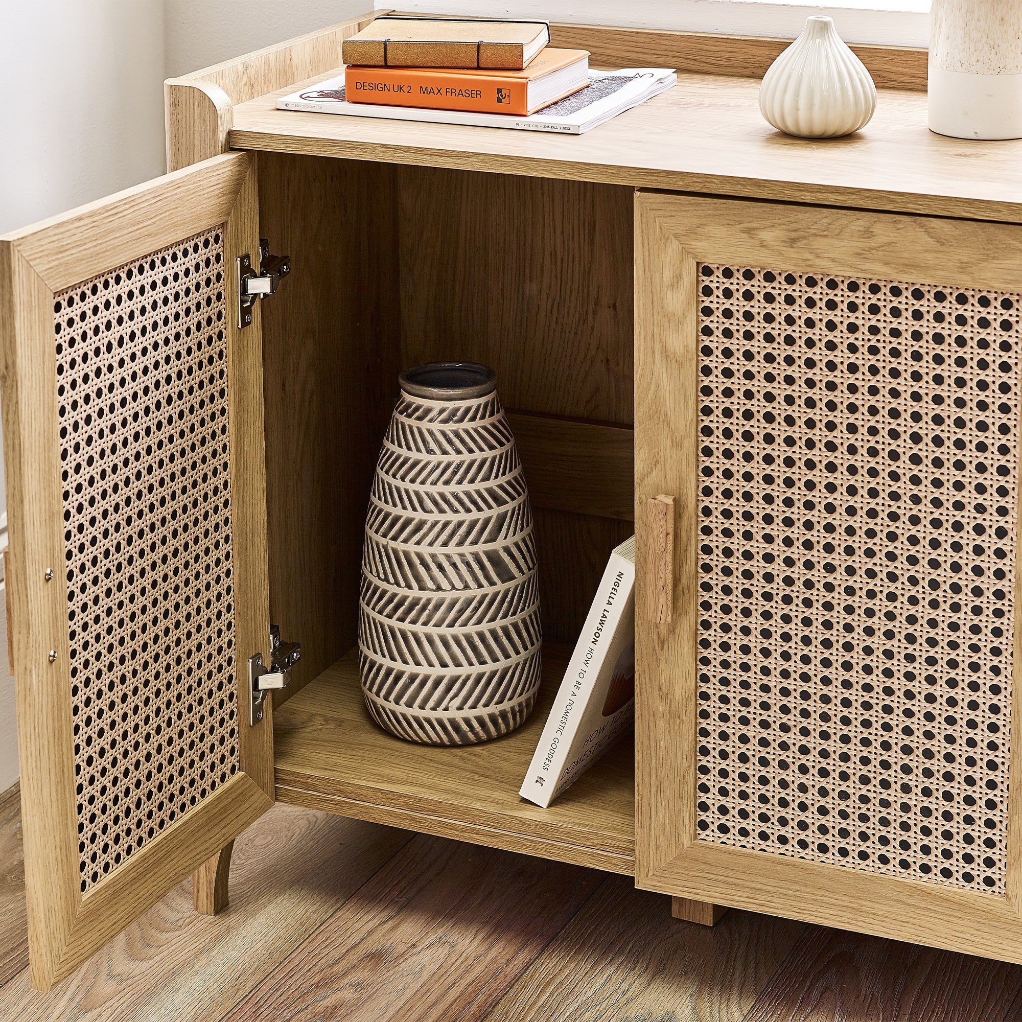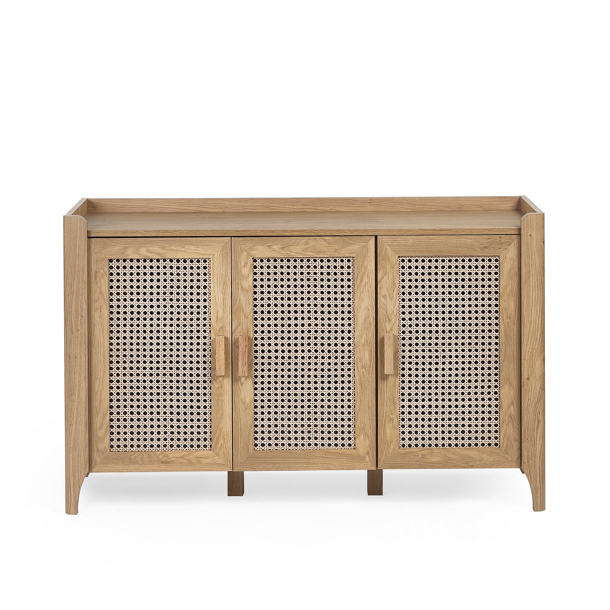 Showcasing a beautifully sleek design with a bohemian feel, the Sydney 3 Door Sideboard offers exquisitely curved edging accompanied by a raised lip around the edge providing a practical addition, stunningly combined with a rattan-effect sticker front. Finished with a natural oak effect featuring three cupboards with built-in shelving allowing you to store key necessities plus extra space on top to place ornaments. All around creating the perfect airy, warm feel within your home.