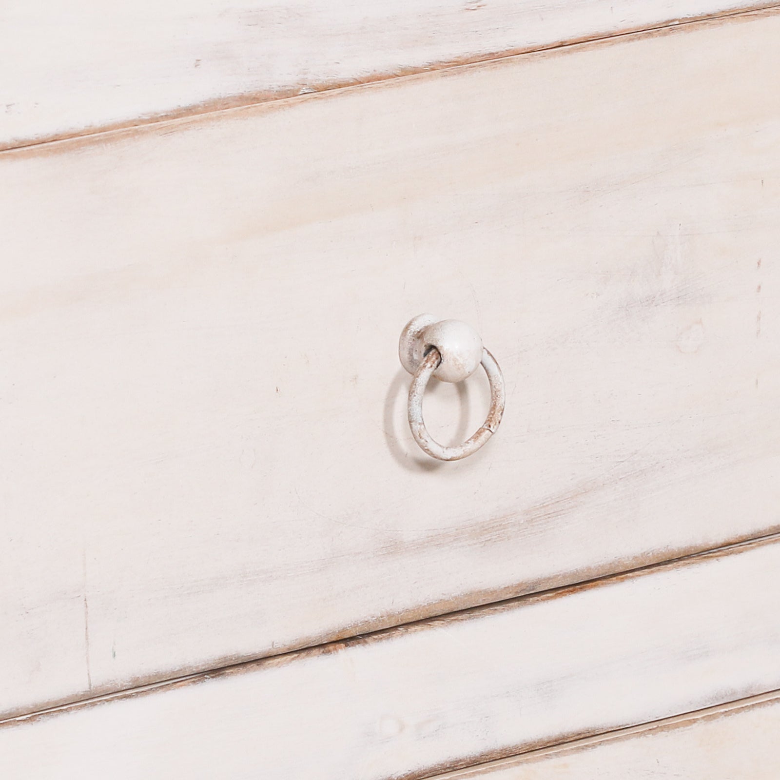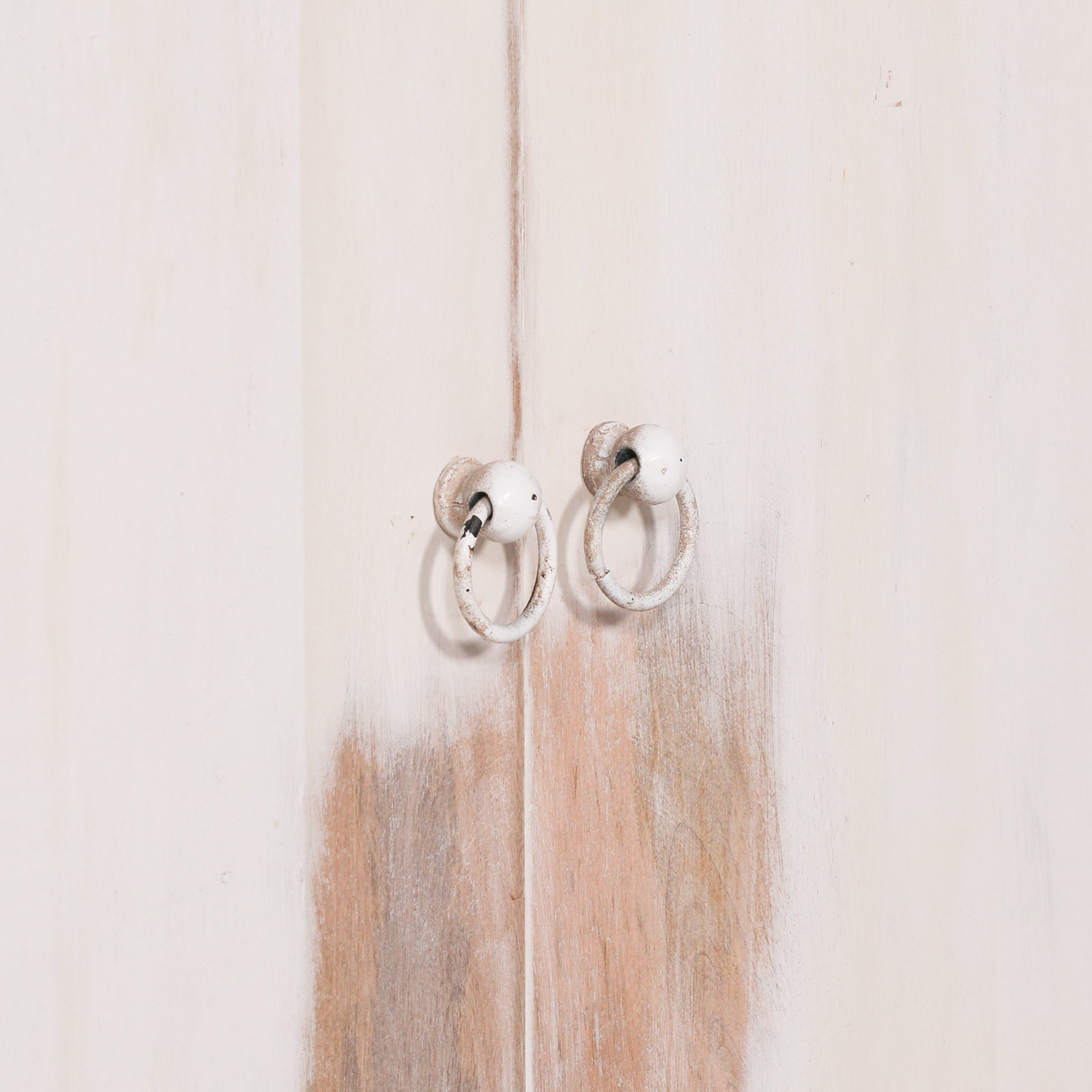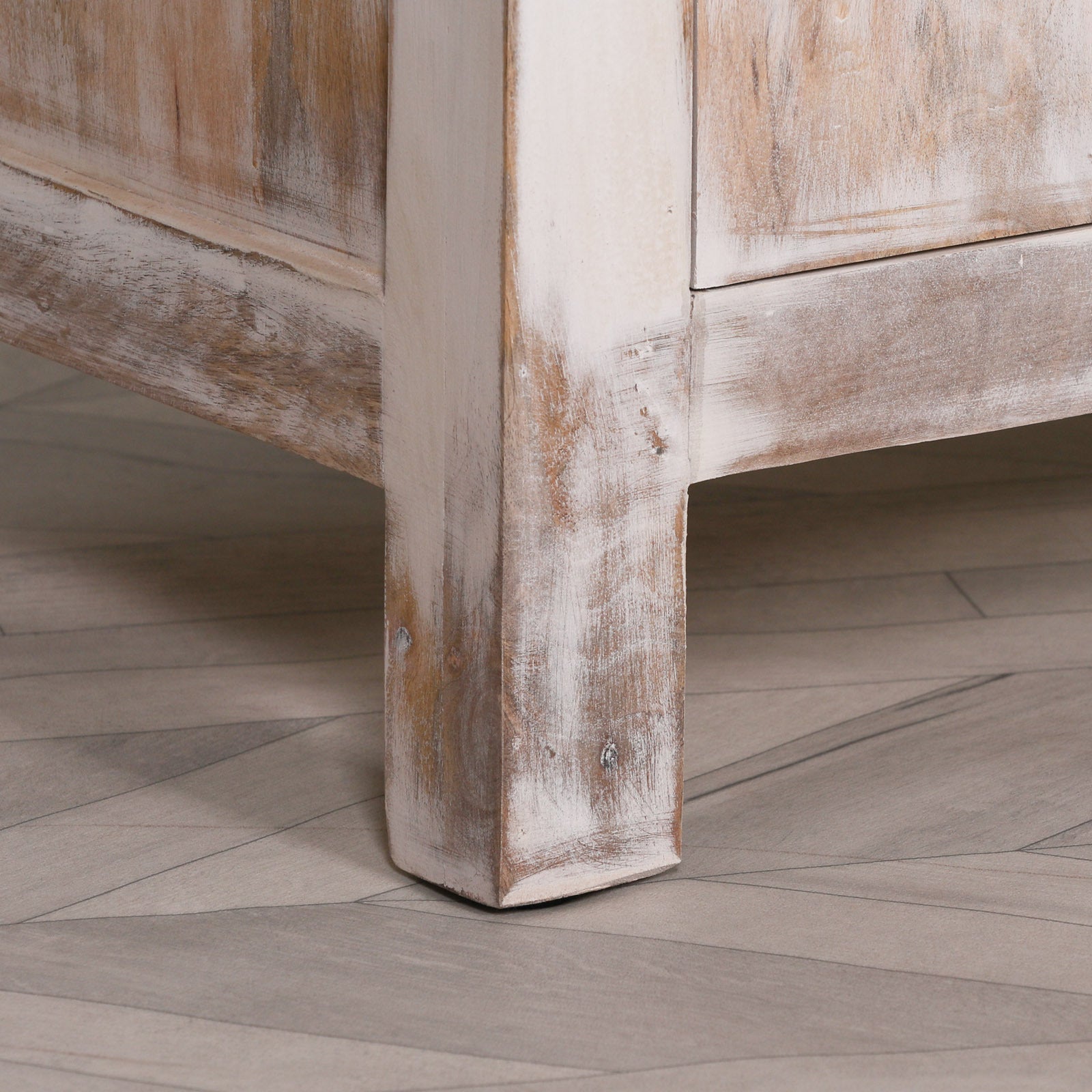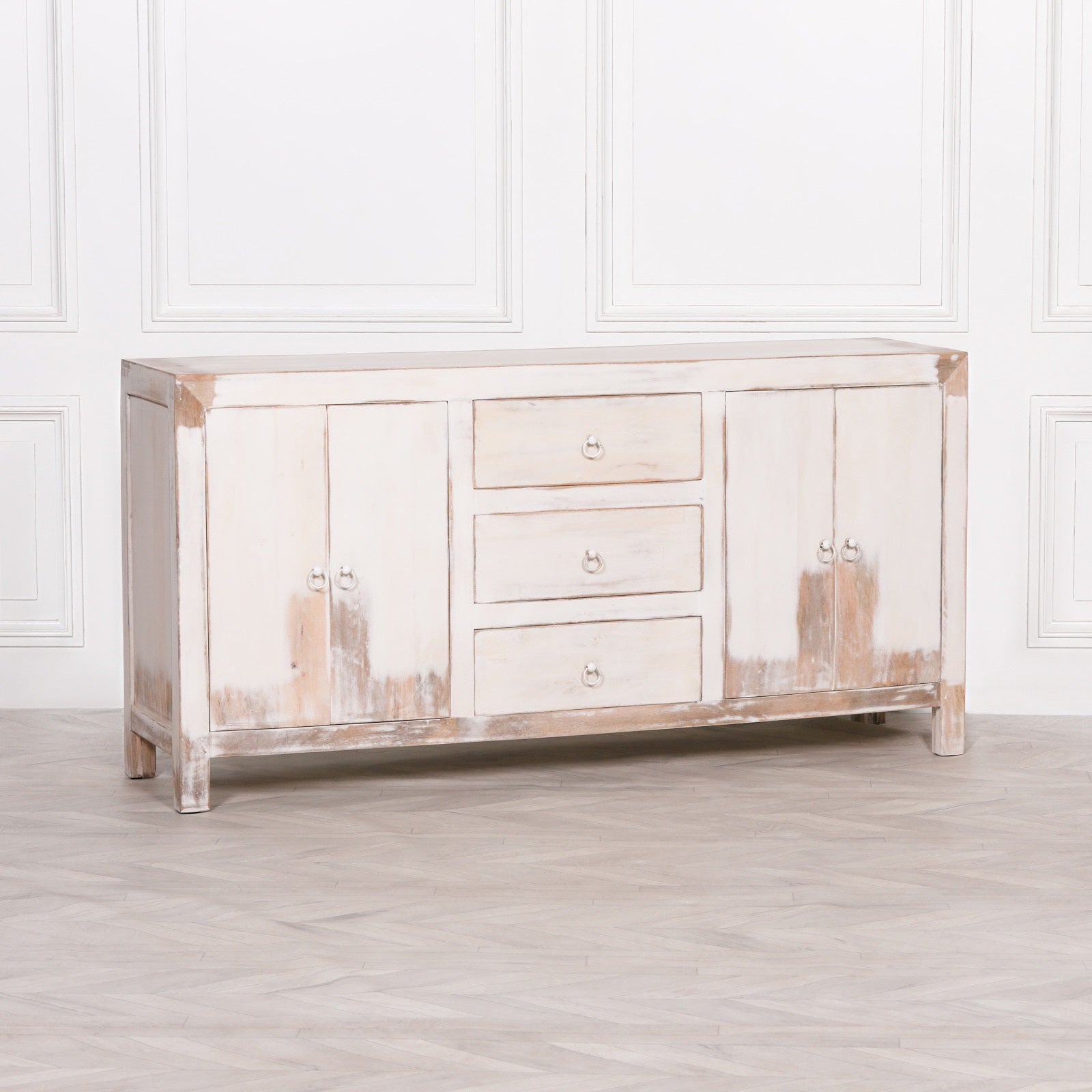 This white distressed oriental sideboard adds a touch of charm to any room. Handcrafted from mango wood, it features four doors and white metal ring handles, all in a weathered white finish.