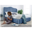 Width (cm) 97Length (cm) 212Headboard Height (cm) 115FeaturesBlue Plush velvetChrome feetSolid Board baseLined design4 inch solid thick frameWinged Headboard