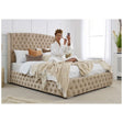 Width (cm) 97Length (cm) 212Headboard Height (cm) 138FeaturesSand napleSolid board baseChrome feetButtoned designSpanish upholsteryWinged Headboard4 inch solid thick frameBeaded wings